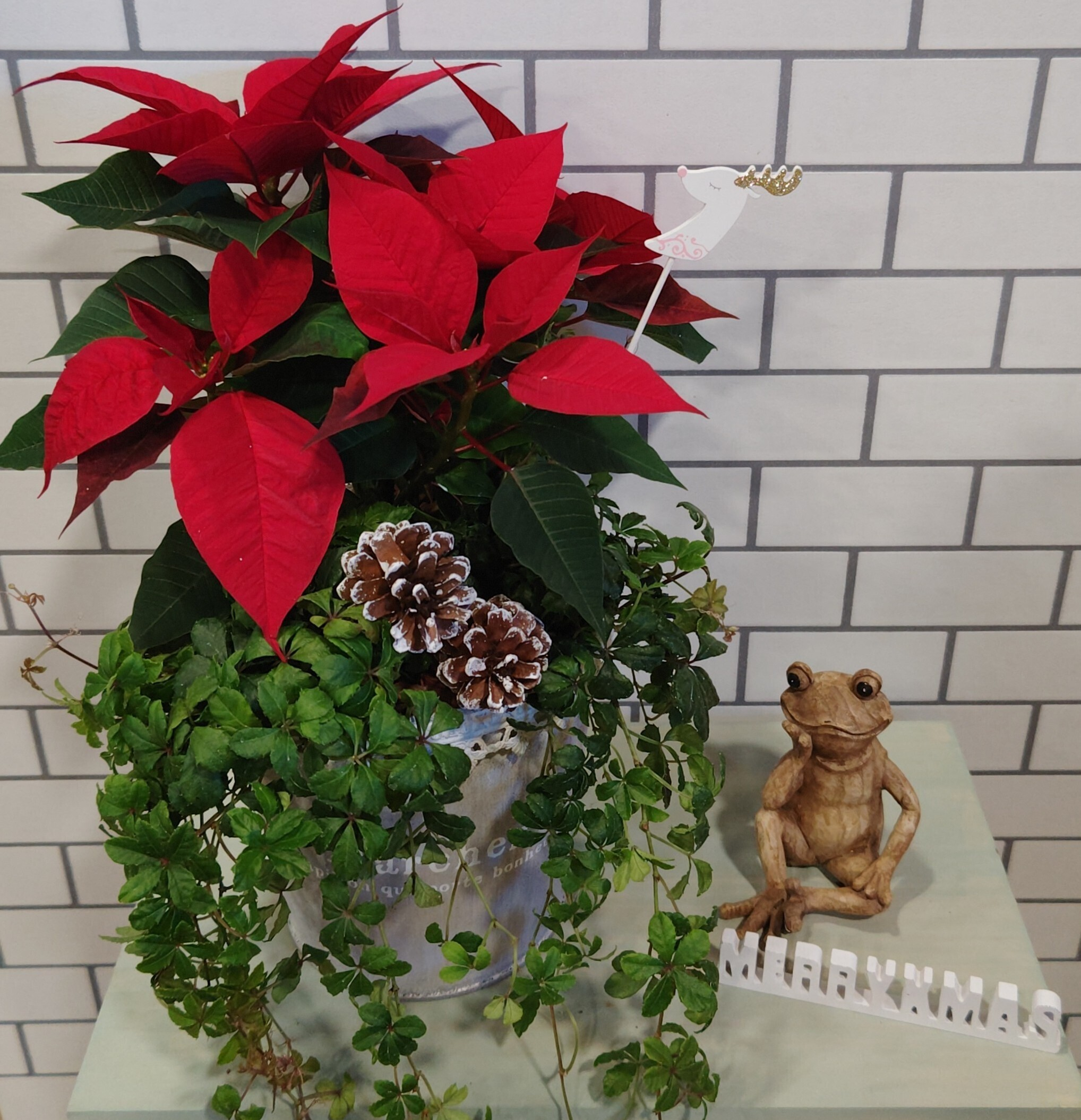 赤のポインセチアは鮮やかで✨シュガーバインと一緒に植えると、ますますクリスマスらしくなって…😆楽しく寄せ植えをしてきました😊トナカイさんのピックも松ぼっくりも可愛くて お気に入りです😍