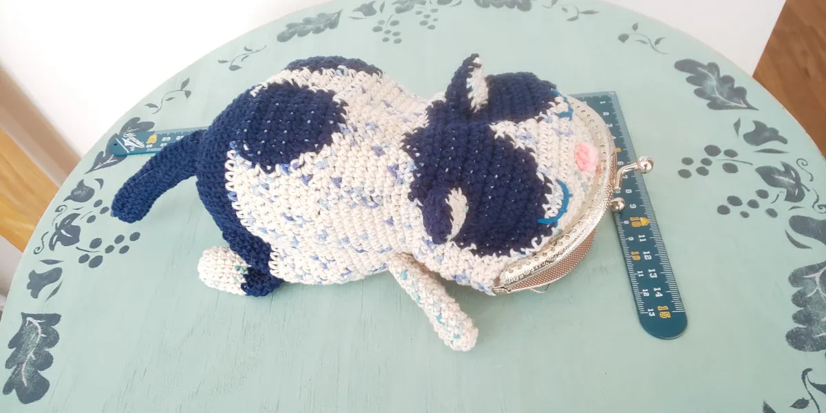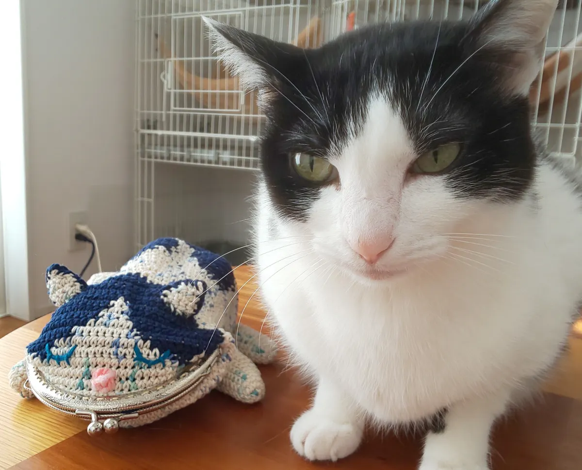 編み図なしで編んでいるので形を作るのに苦労しましたが、飼い猫に協力してもらって手足の模様までそっくりに作りました😆