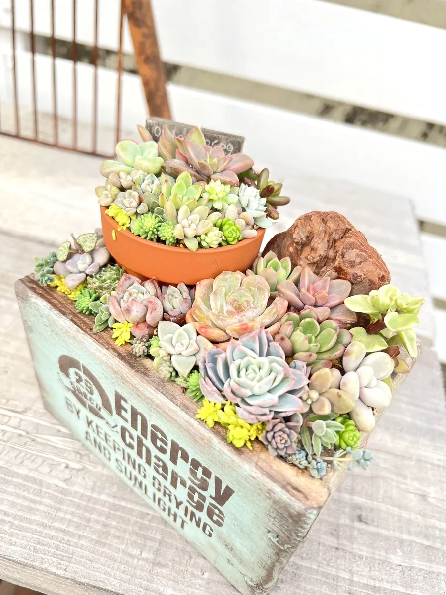 木箱でロックガーデン風にアレンジされたのですね