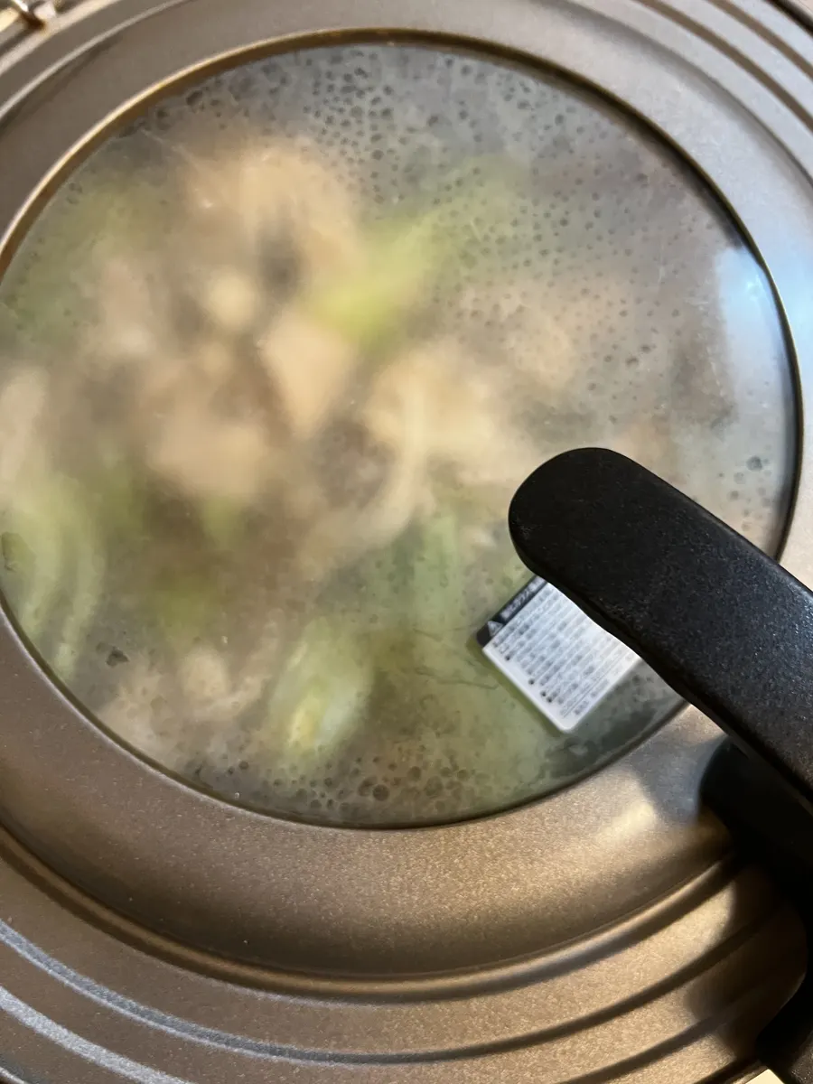 ⑥あらかた火が通ったら茎としめじを入れて蓋をして弱めの中火で3分ほど蒸し焼きにする。