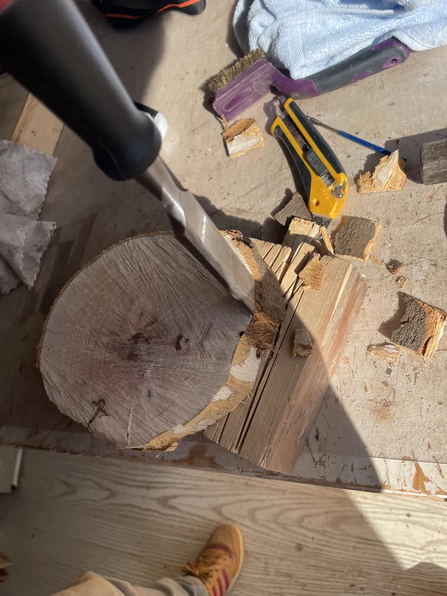 続いて白樫の樹皮をノミとトンカチで叩きながら剥いて見ました。