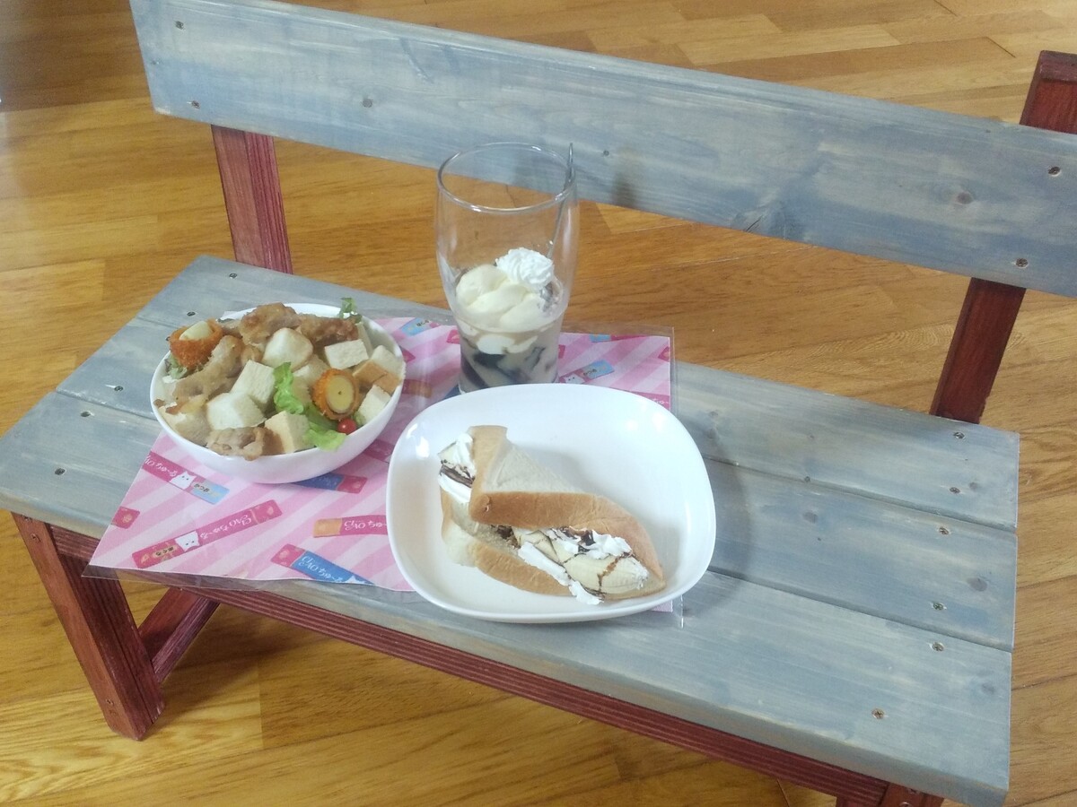 あにーさん専用オリジナルベンチとコーヒーゼリーソフトクリーム添えにパンサラダ✨ (●´ㅂ`●)