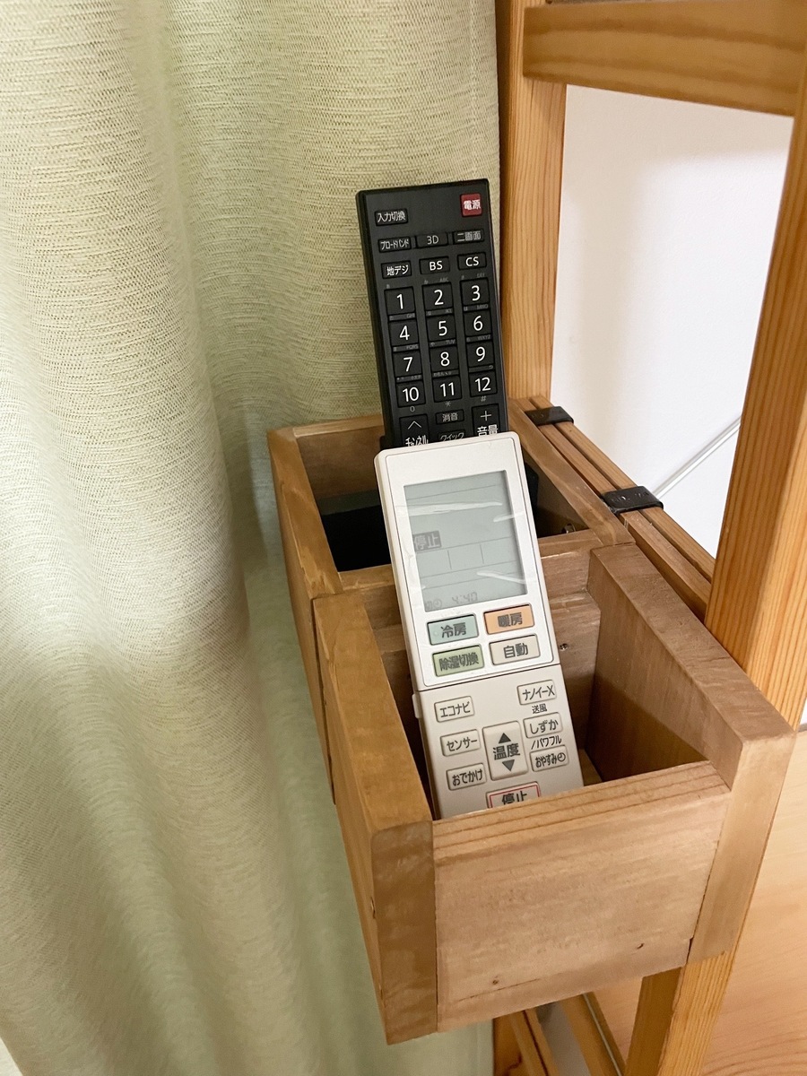 結局『リモコンなくなった😩』とよく騒ぐ部屋主のためにリモコン収納にしました✨ついでにボールペンもなくしやすいので、それも入れておけばいいんじゃないですかね🤪