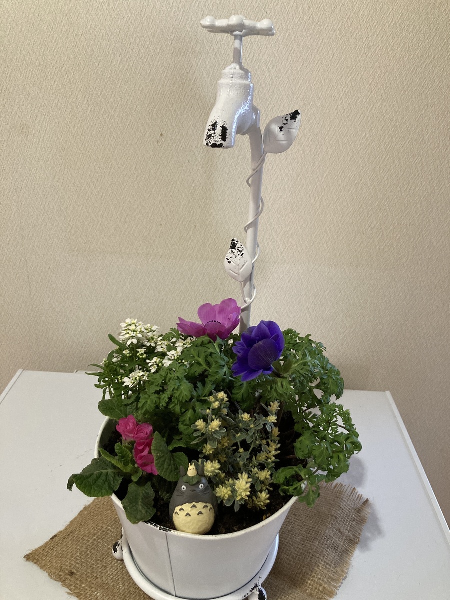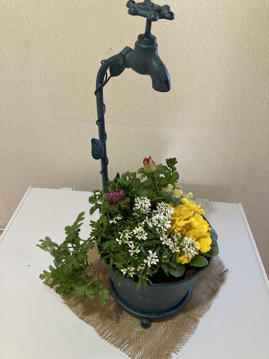 投稿を表示色違いの蛇口の鉢に お花の雰囲気も変えられて、お洒落ですね✨