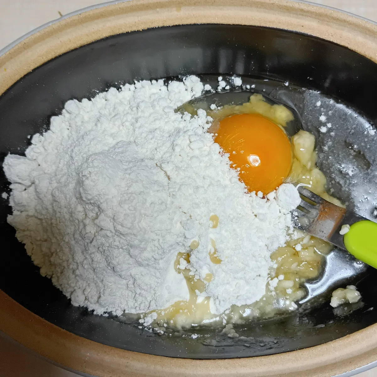 ホットケーキミックス、卵、油を入れてよく混ぜる