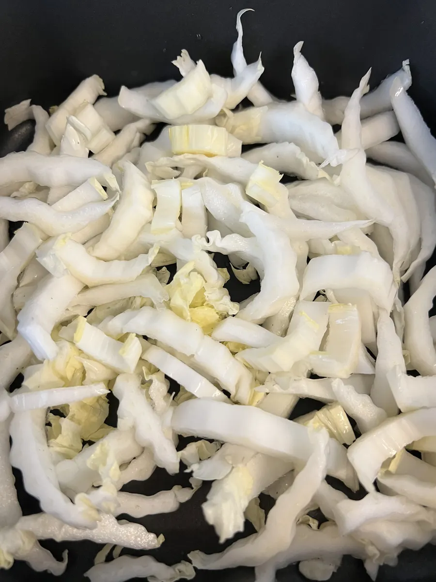 ①白菜は芯と葉に分けて、それぞれ細切りにする。