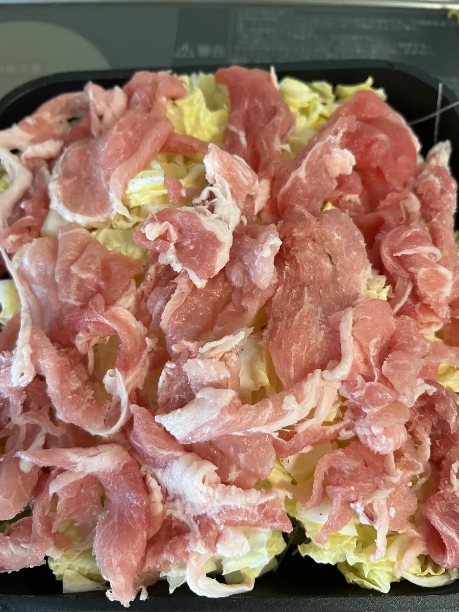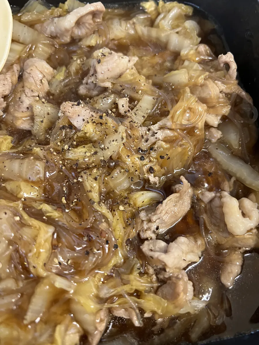 ②フライパンに芯の切ったものを敷き詰め、その上に春雨、葉の切ったもの、豚肉の順に重ねる。