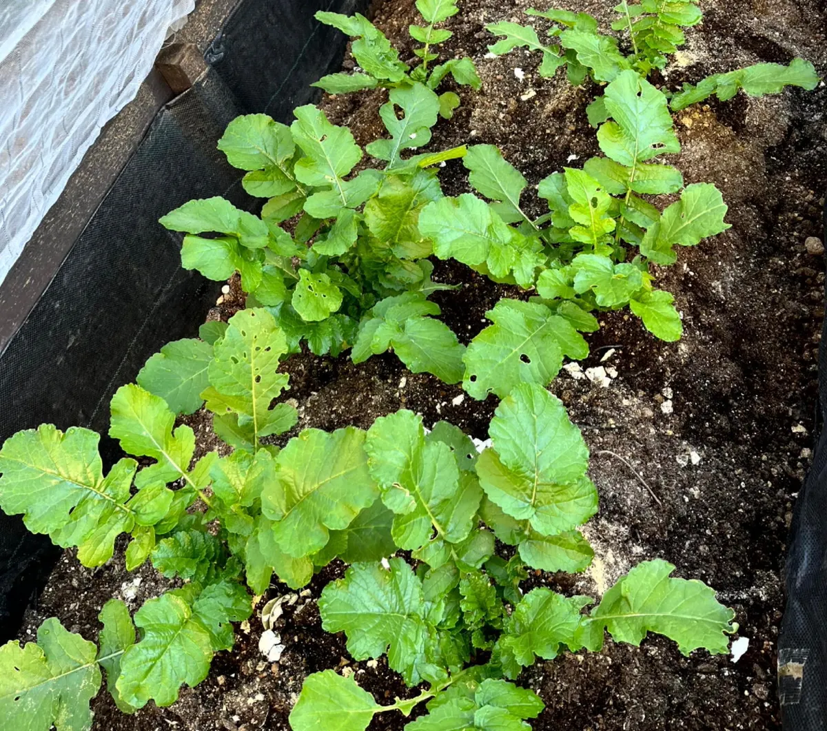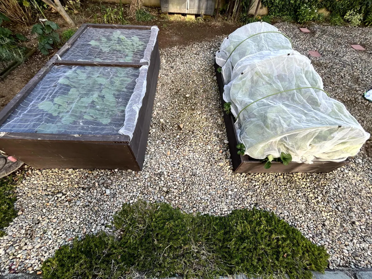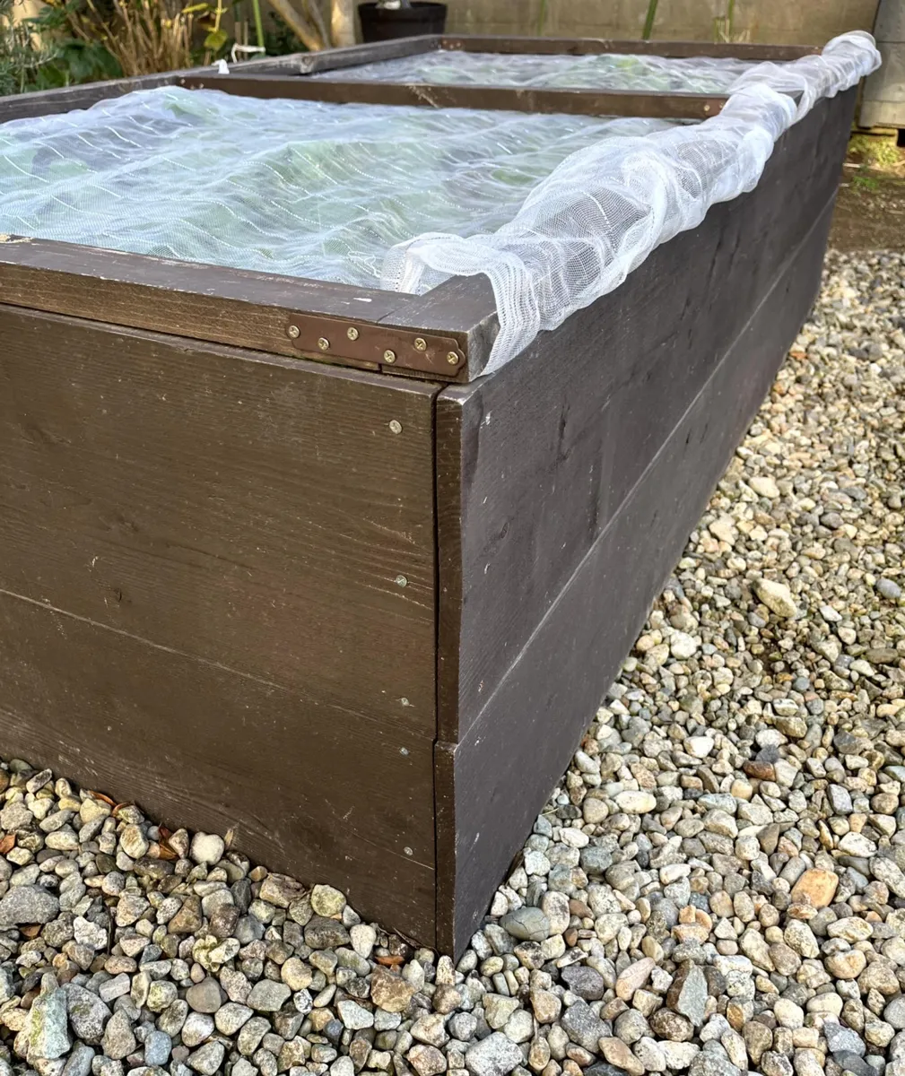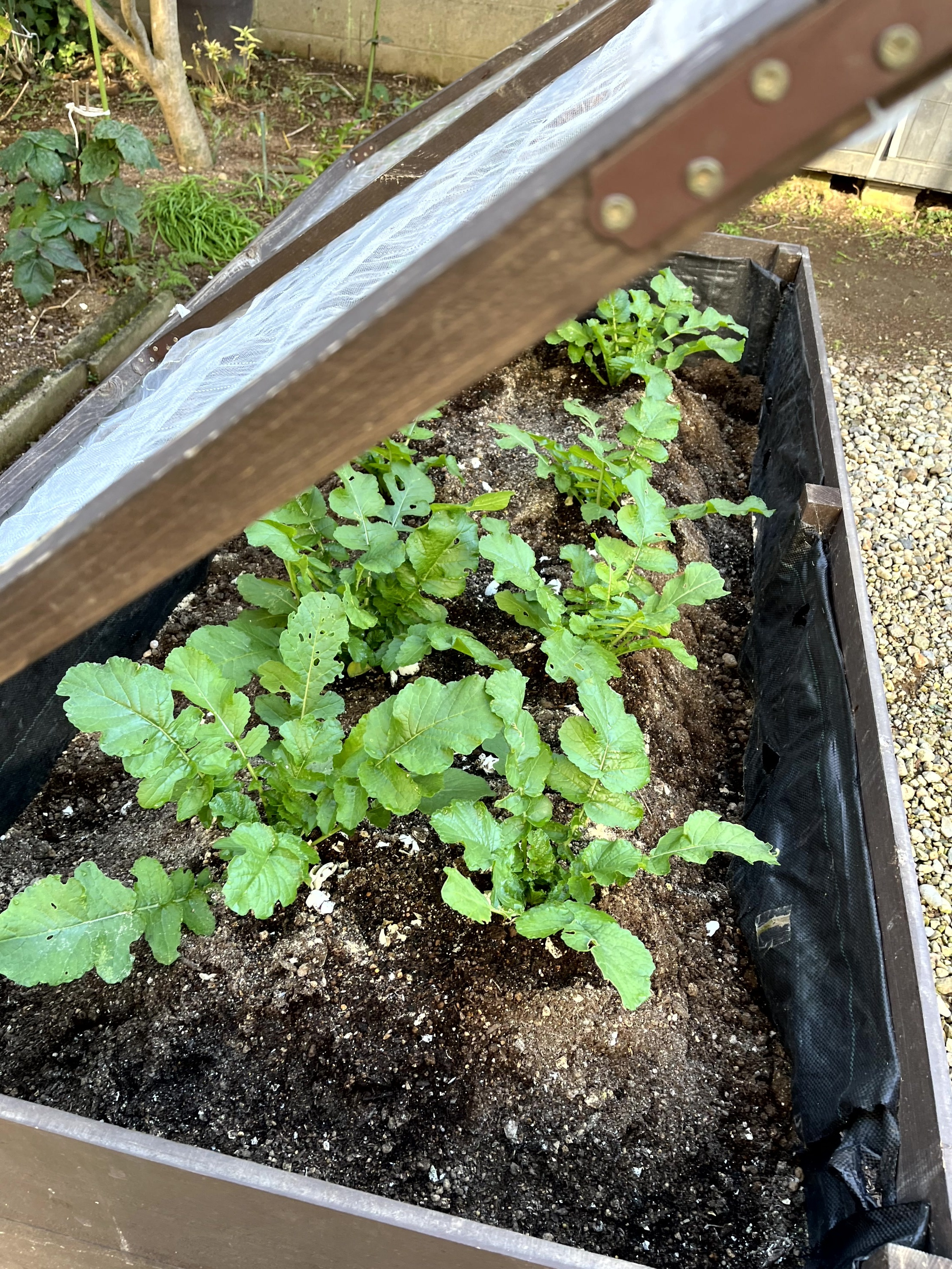 ヘッドカバー付の深めのレイズドベットにダイコンの種を蒔きました。開閉式のヘッドカバーには、虫よけネットを張りました。