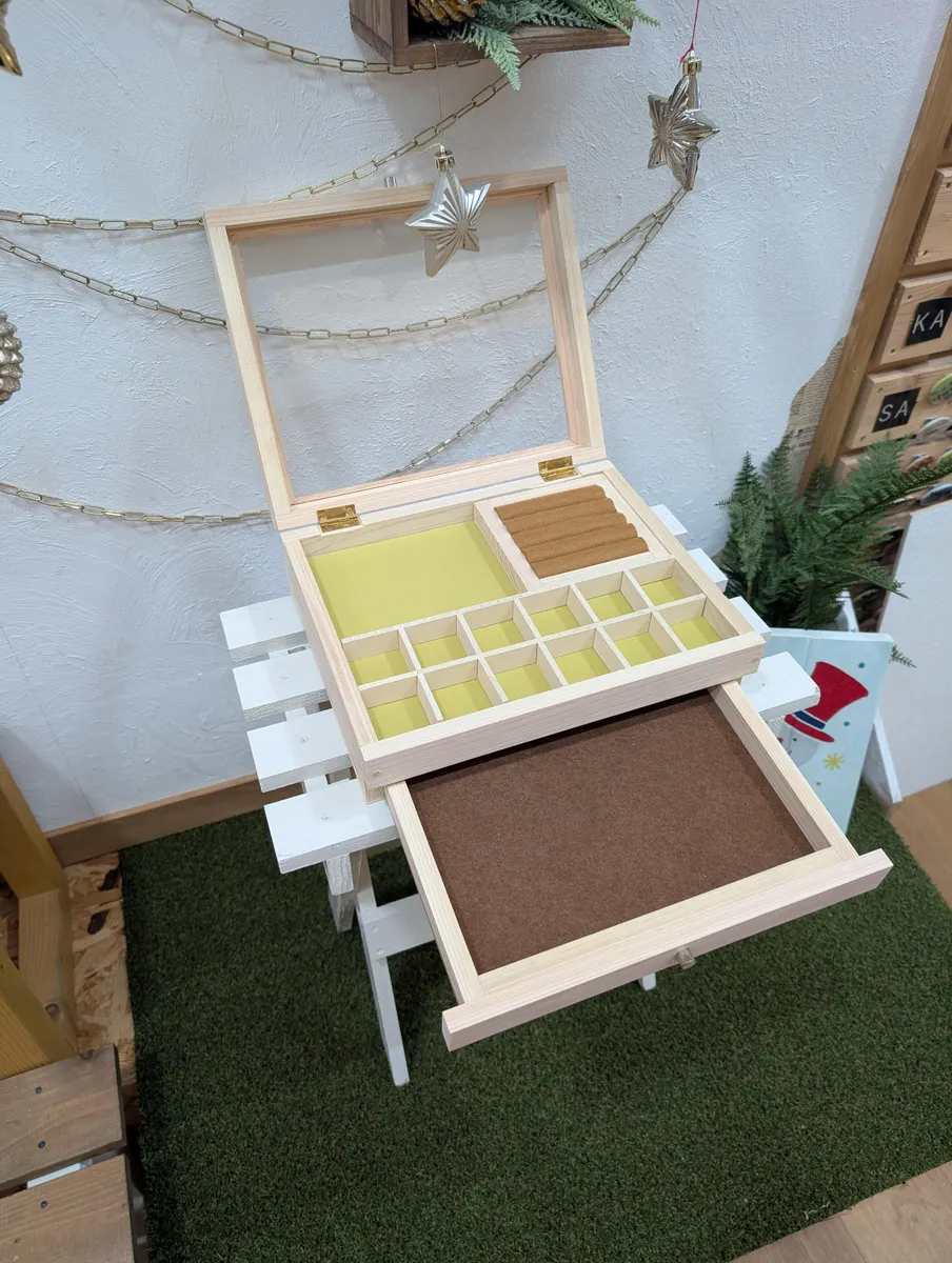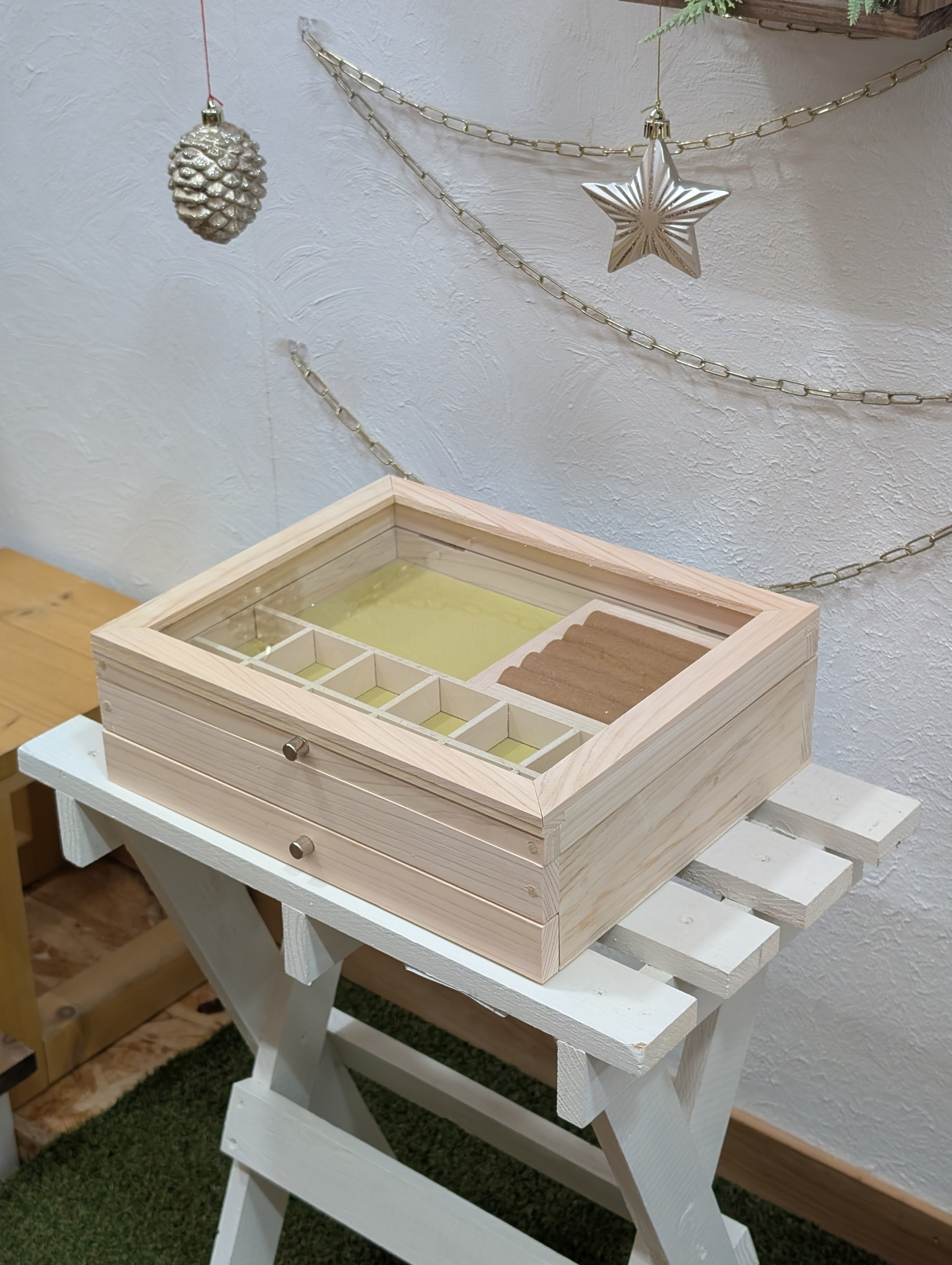 トップ > ワークショップ > 棚・収納 > 桧で作るジュエリーBOX HL.8 おひで 2025/12/08 12:46 桧で作るジュエリーBOX HL.8 本日はこのところ定番化しつつある愛知県稲沢の稲沢ハーモニーランド店でワークショップ。 今日はストアオリジナルのジュエリーBOXを作ってきました。 今回も結構手の込んだもので、ネジはとことんダボでかくし、 細かい調整もあって、時間も元々4時間設定のもの。 丁番のことに結構時間は取られましたが、約2時間半で完成です。 引き出しも凝ってて、 ちょっと置いておくのはちょうどいい置き場になってます。 今日はこれでおしまい。 このあと何しよっかなぁ。 いいね 共有する 共有する X LINE リンクをコピー コメントする 6 件の返信 (新着順) ミュートしたユーザーの投稿です。 投稿を表示 はっちゃん 2025/12/10 20:25 素敵 いいね 返信する ミュートしたユーザーの投稿です。 投稿を表示 キコ 2025/12/09 20:12 素敵ですね。 2段になっていて、沢山入りそうです。 私も作りたいです(^o^) いいね 返信する ミュートしたユーザーの投稿です。 投稿を表示 ちょこっぺ 2025/12/08 21:21 このお店はストアオリジナルが充実していますね😊いいなぁ いいね 返信する ミュートしたユーザーの投稿です。 投稿を表示 おひで 2025/12/08 23:45 ちょこっぺ お客さんの声で始まったそうですよ。多く作ってると、過去に作ったことがあるものが回ってくることがあるから。 いいね 返信する ミュートしたユーザーの投稿です。 投稿を表示 ハッピー 2025/12/08 19:17 すごく凝っている作品ですね☺️ たくさんジュエリーが入れれますね💎 いいね 返信する ミュートしたユーザーの投稿です。 投稿を表示 おひで 2025/12/09 17:08 ハッピー といっても、本人そんなに持ってない、、、。 いいね 返信する ミュートしたユーザーの投稿です。 投稿を表示 ナオ 2025/12/08 14:14 素敵💓難しそうだけど、こういうのは作りたいです‼️4時間かかるところ2時間半で作ってしまうなんてすごい🤩 いいね 返信する ミュートしたユーザーの投稿です。 投稿を表示 おひで 2025/12/08 20:35 ナオ 今回は一人だった事もあって、つぎ、そしてまた次と進んだからだと思います。冗談で「3時間くらいでできるんじゃないの?」って言ってたんですけど、それより早くできちゃいました。しかも、調整なしで捉えれば2時間でできたようなものなんです。 いいね 返信する ミュートしたユーザーの投稿です。 投稿を表示 ナオ 2025/12/09 13:32 おひで マンツーマンで作れるなんて、贅沢な時間でしたねー😙 うらやましい🎵 いいね 返信する ミュートしたユーザーの投稿です。 投稿を表示 まろん 2025/12/08 13:40 素敵💓に出来ましたね😄 アクセサリー💍いっぱい入れれるね🎶 ステンシルするんですか😄 いいね 返信する ミュートしたユーザーの投稿です。 投稿を表示 おひで 2025/12/08 20:32 まろん 今回はこのあとのことも考えてステンシルはしませんでした。このところの稲沢で作ったものと、マイストアの吉田店で作ったものをうまく組み合わせできたらと考え中ですよ~。 いいね 返信する