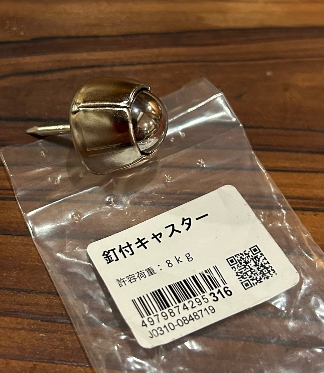 と、言うことでとりあえず100均のキャスターはがして。テープ跡が残ってるけど弾力があるのでクッション材になるかと考えてあえて残してテーパードドリルビットで下穴開けてから、ゴムハンマーで叩きました。