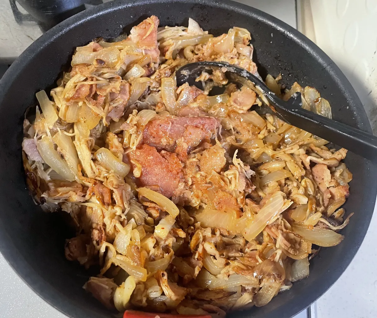 ベーコンがチリっと焦げ目付く感じで脂も出てくれたら、玉葱・えのき加えて炒めるぞぉ〜😁👍🥓🧅🍄🟫🍳🔥✨