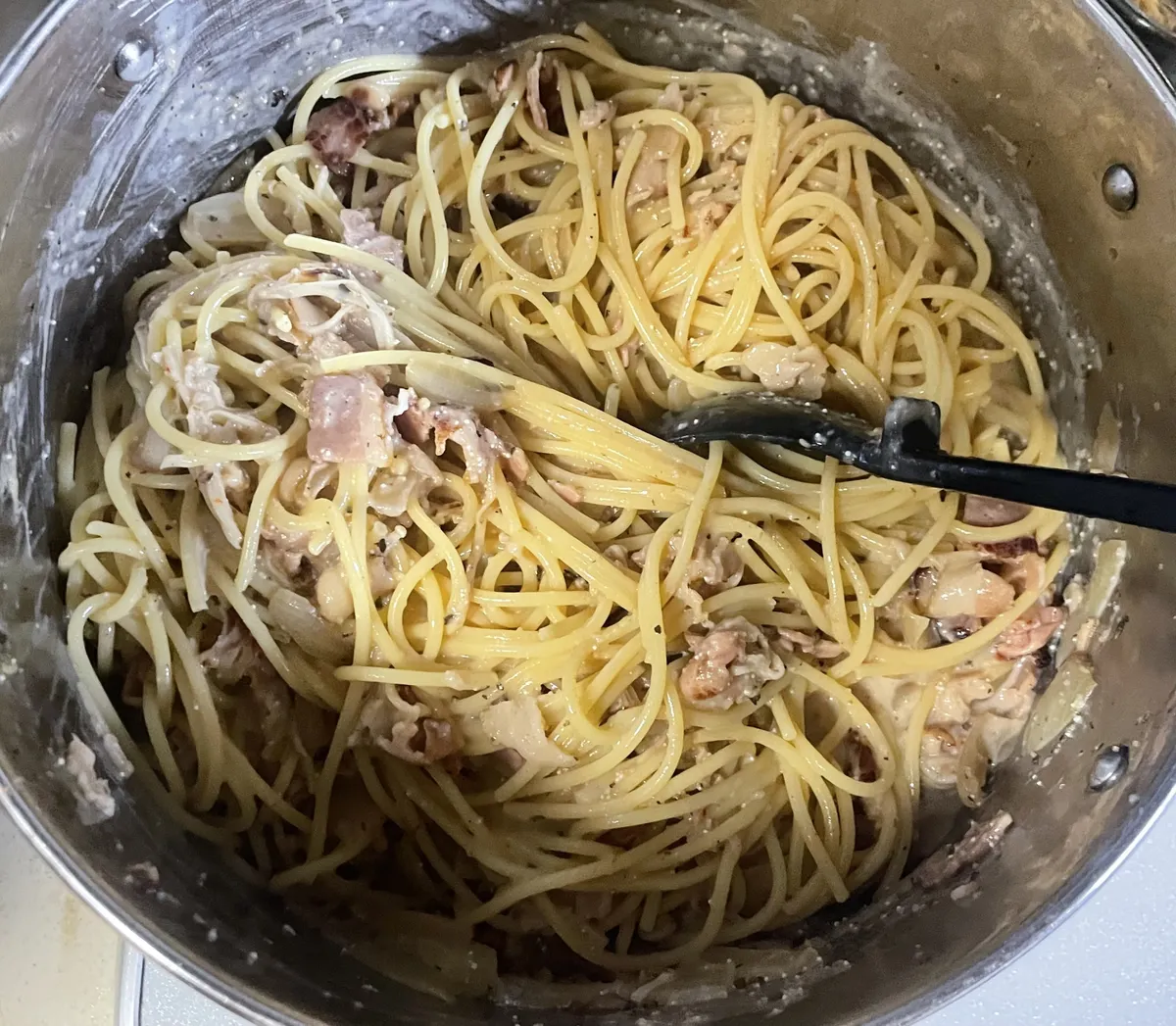 10分茹で書いてあるパスタを5分茹でで引き上げ、寸胴でパスタが塩茹でなんてで乳化しとるのを麺に絡めるのにチョイ足しで合流ぅ〜🤣🍝🤝🐟🟠🥓🧅🍄🟫✨