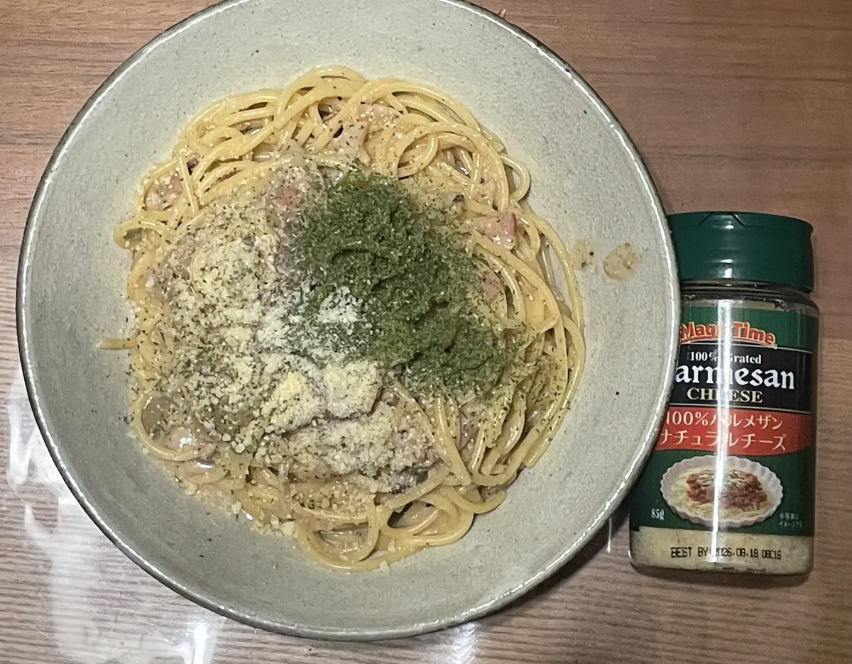 後はアルデンテまで火が通ったら、パセリとお好みでミル挽き黒胡椒・パルメザン掛けて速攻で召し上がれぇ〜😆🙌🍝🔜‼️✨