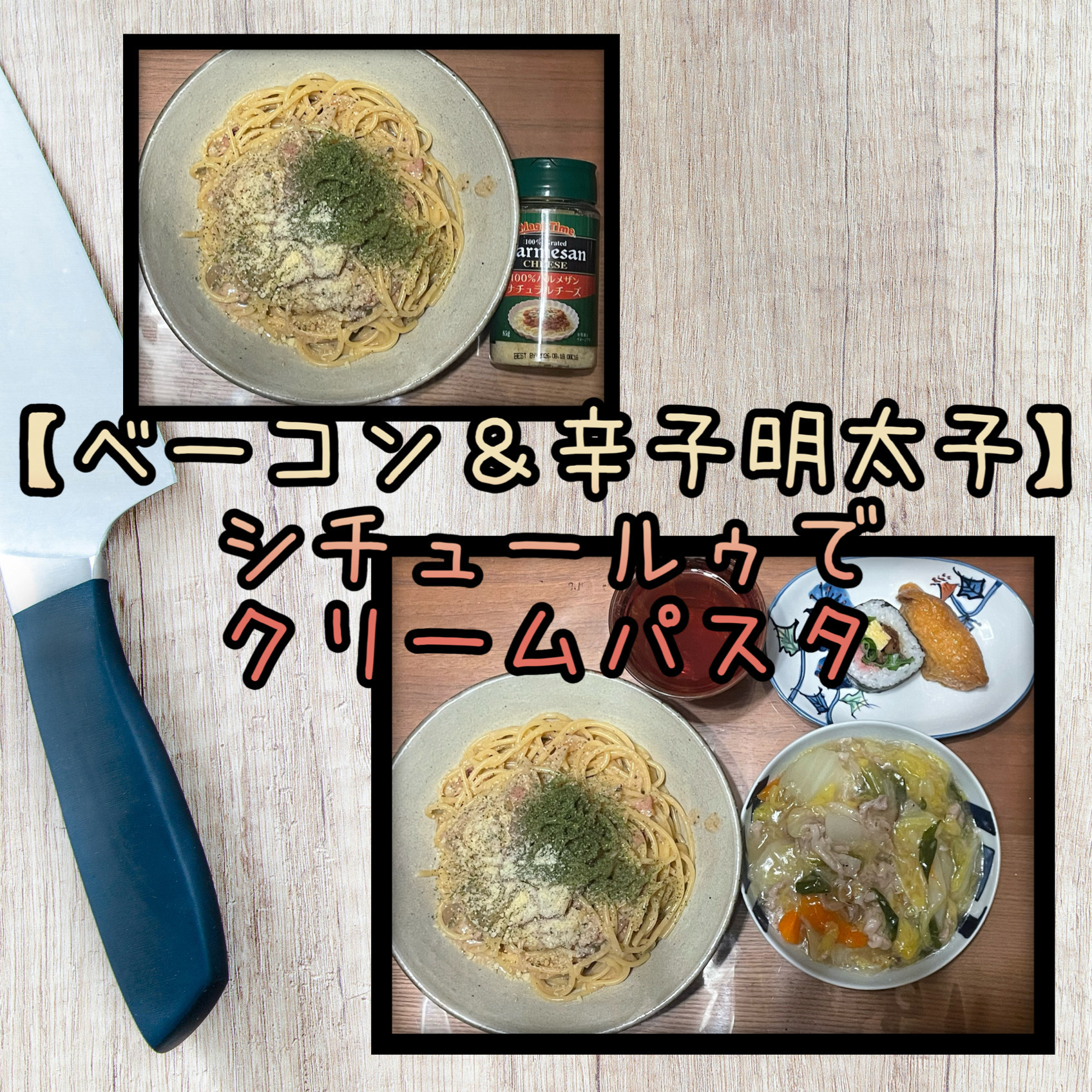【阿呆安ベーコン&ふるさと納税GETの訳あり辛子明太子で作る「クリームシチュールゥで作るたらこパスタ😋🥓🐟🟠🤍🍝✨」】
