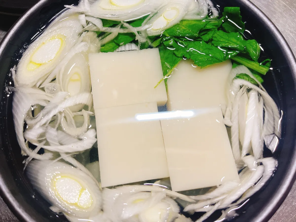 加熱後、大根の上にお餅をのせネギも入れて、水と白だしを入れます。