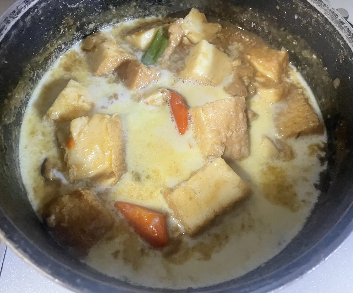 無けなし残機カレーだけでは流石に具材増えるので、麺つゆ・厚揚げ・カレー粉・ガラムマサラ入れて焦げない様中弱火程度で煮たら豆乳投入ぅ〜😁👍🫘🥛➰🥘‼️💨✨