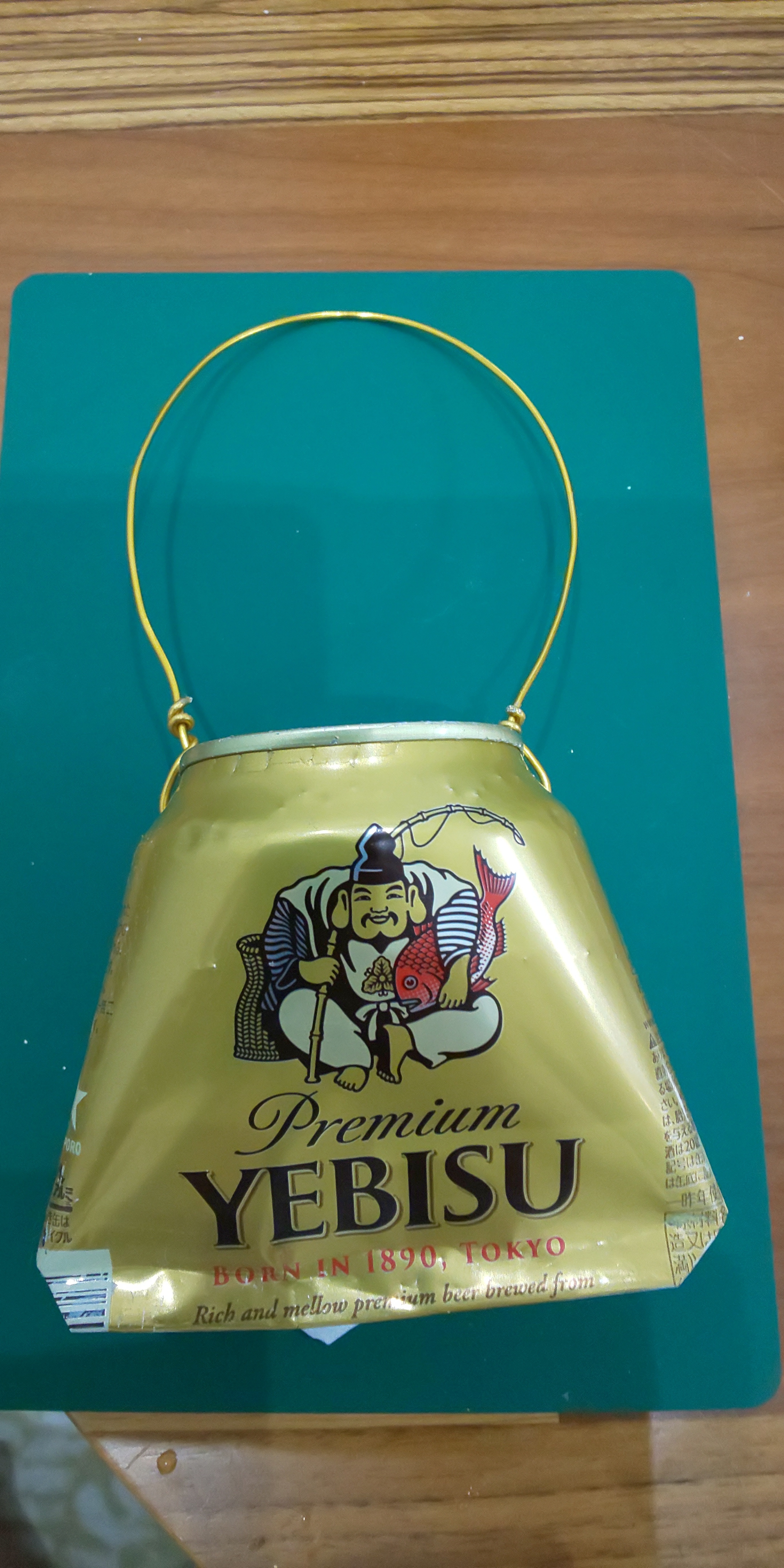 この形の缶は、お店にぶら下がっているのをみていいなぁと思ったことがあります。ビール缶ならちょうどいいのですね♪