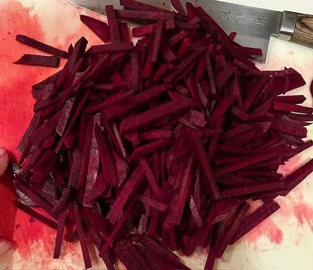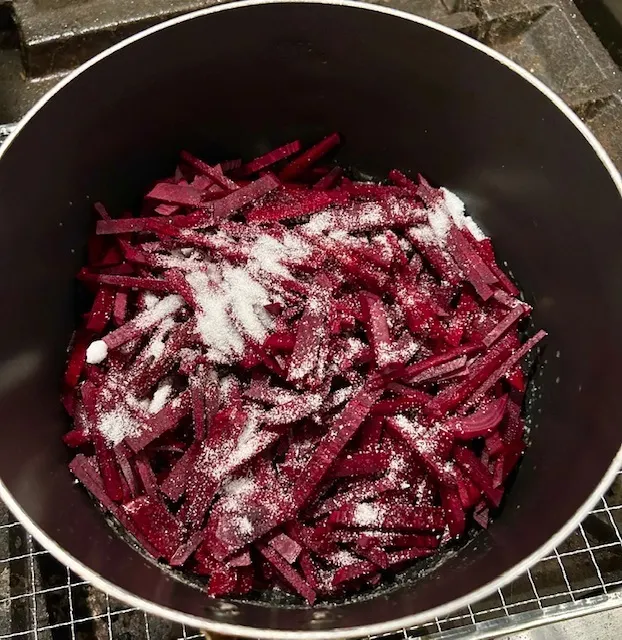 ④小鍋にバター大1を溶かし、千切りにしたビーツと塩小1を入れて混ぜ、蓋をして弱火で12~15分蒸し煮する