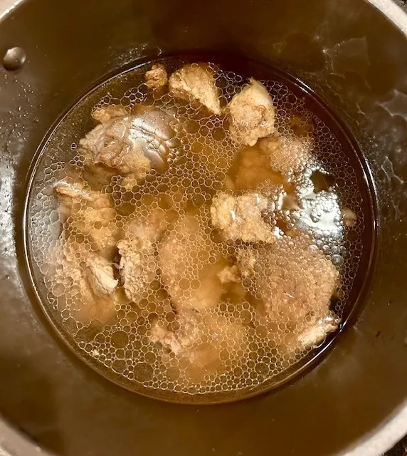 ⑥圧力鍋に②のスネ肉と被るくらいの水を入れ、20分加圧する。