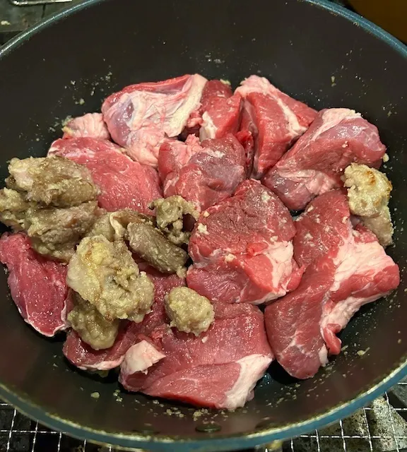 ②スネ肉とニンニクのみじん切りをフライパンに入れ、焼き目が付いたら①の熱湯を注ぎ3分ほど茹でて取り出して水洗いしておく。