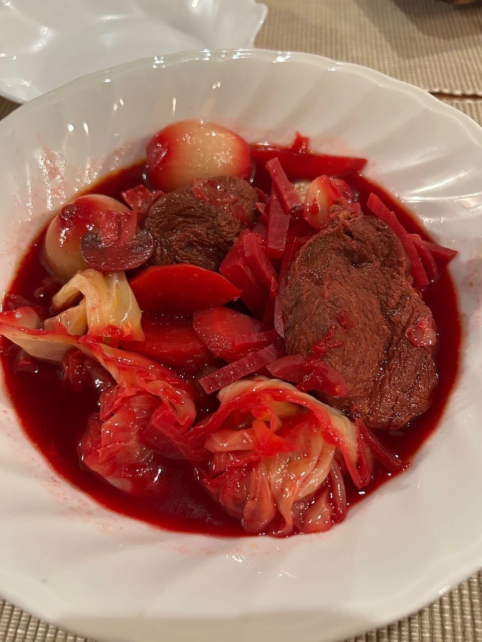 投稿を表示美味しそう🤤ビーツ食べたことないです。いつも凝ったお料理、本格的で凄い〜👏野菜もたくさんでいいですね🍲