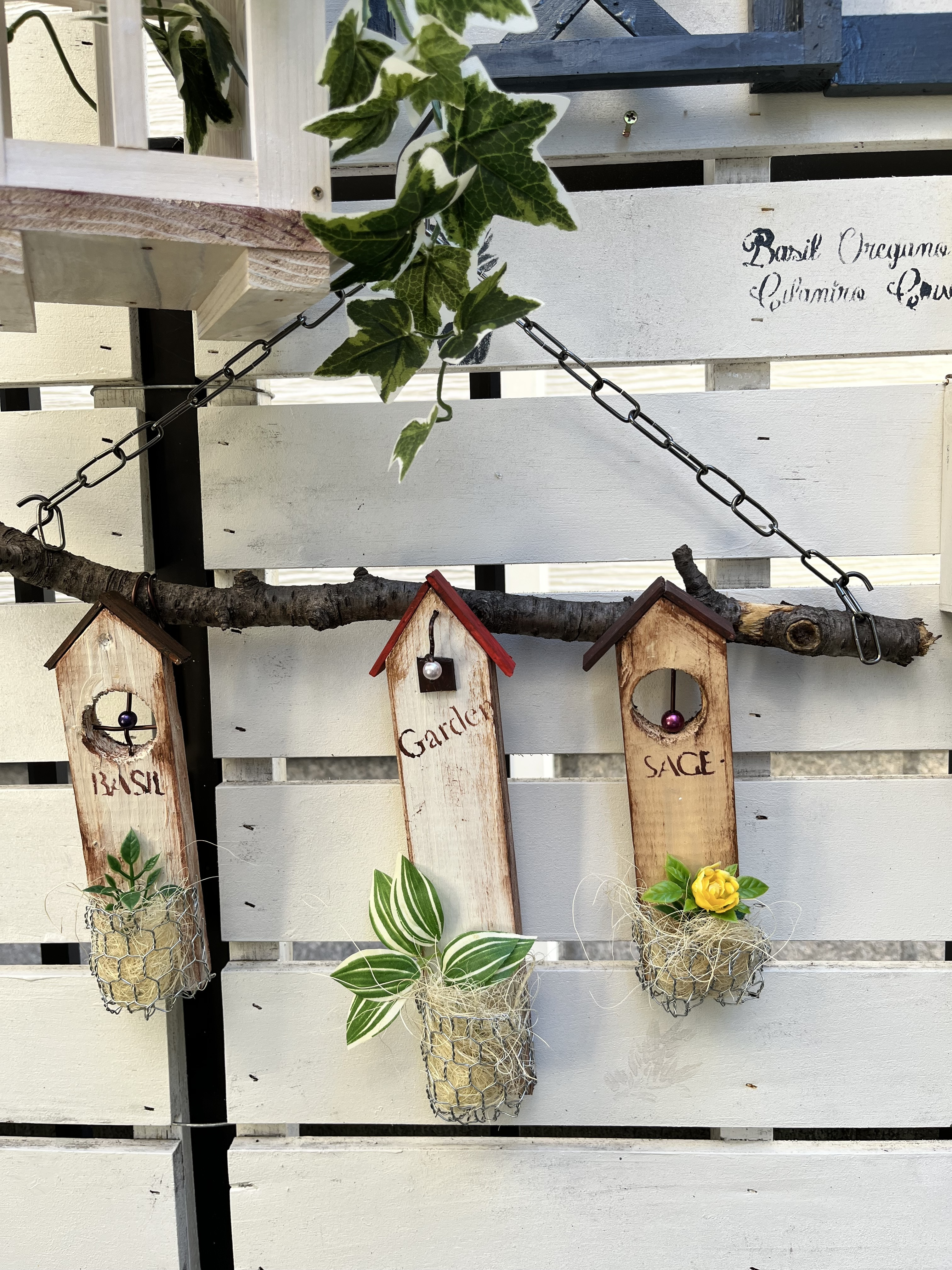 投稿を表示3つ並んだおうち可愛いね💕端材の板って何かに使えそうで取ってあるけど、その何かが分からないのよね😂拾い物の枝とかチキンネットの余りとか、いろいろ組み合わせていくとこんなに使えるインテリアが出来ちゃうのね😄アイデアに拍手👏