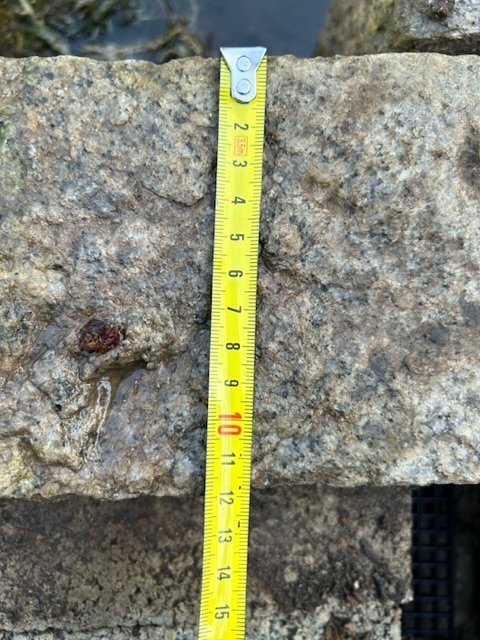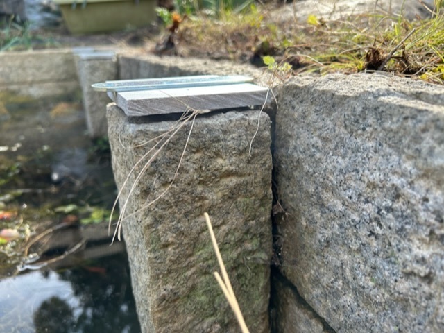 池の壁を構成している板石とそれを支える延石との高さにわずかながら段差があるんだけどそれは手持ちの端材使って合わせちゃおう。