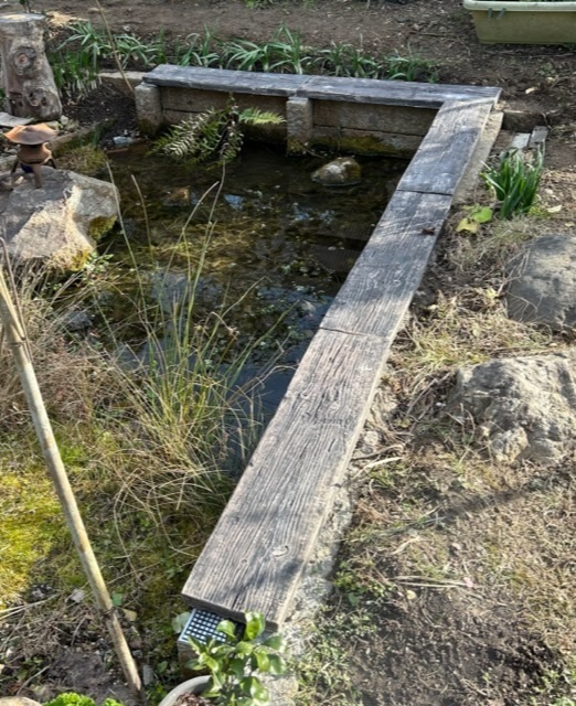 防腐剤入の塗料を塗ることも考えたけど万一池に影響があると困るし…。