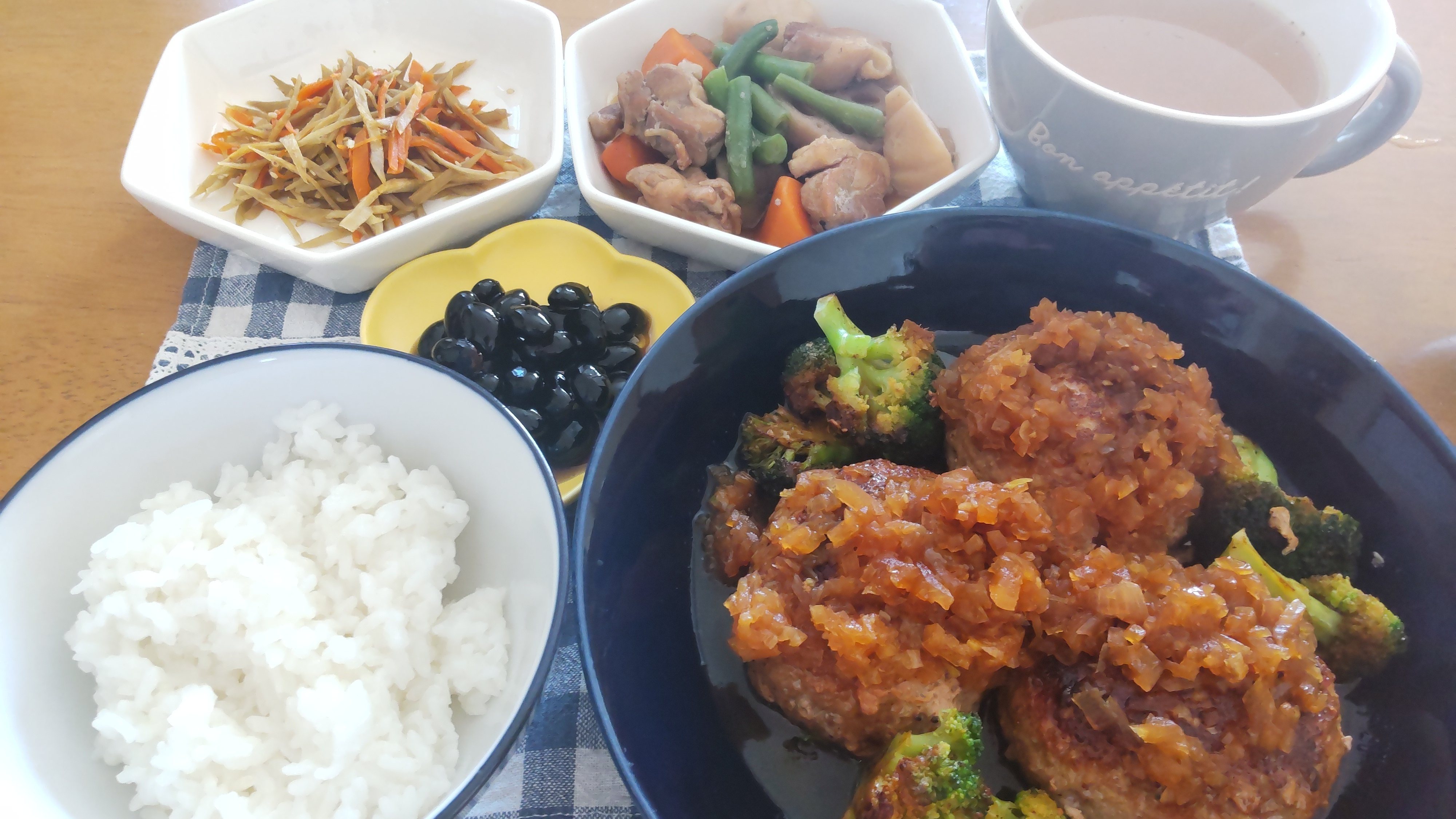 ハンバーグソースは、みじん切り玉ねぎをバターで炒めて、砂糖、醤油、酒、みりん、酢、ニンニク、塩コショウで煮詰めました。コンソメスープをつけました。