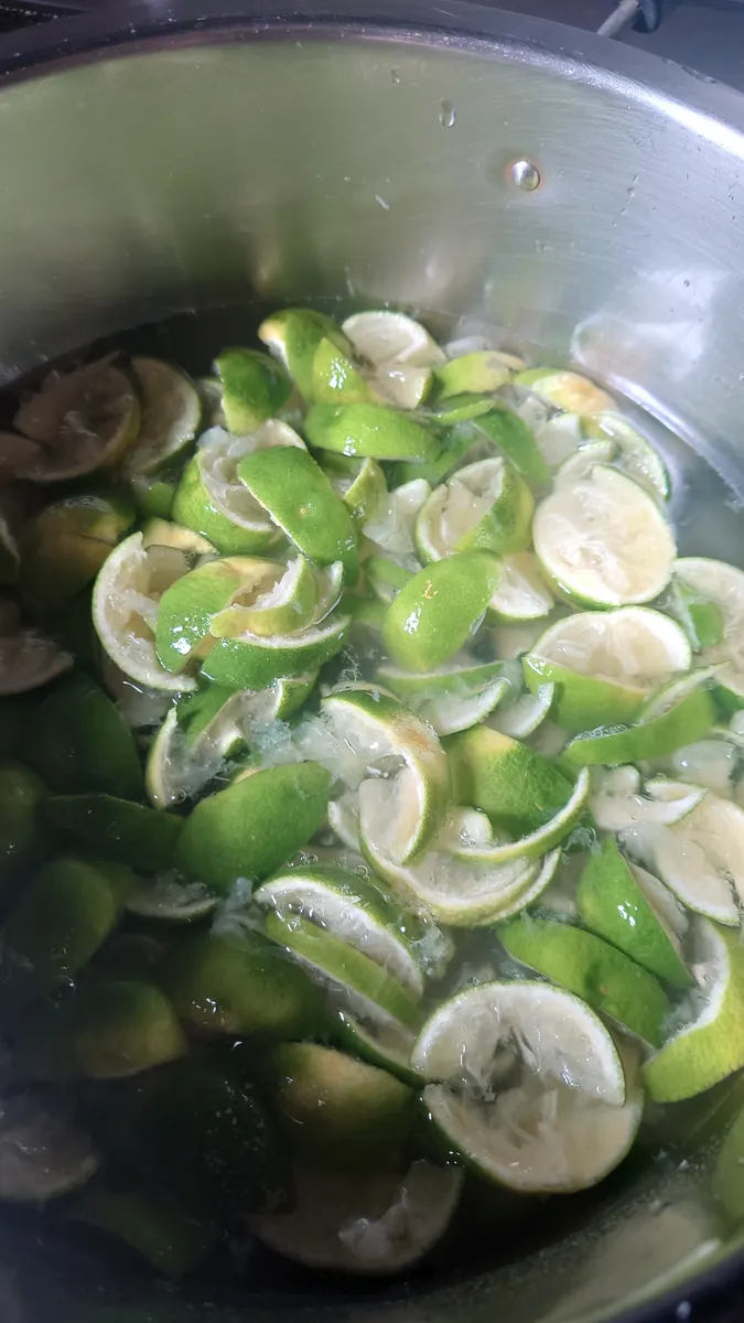 絞ったあとのすだちを粗く切って たっぷりの水に塩を少し入れて茹でます 5分ほど茹でたら