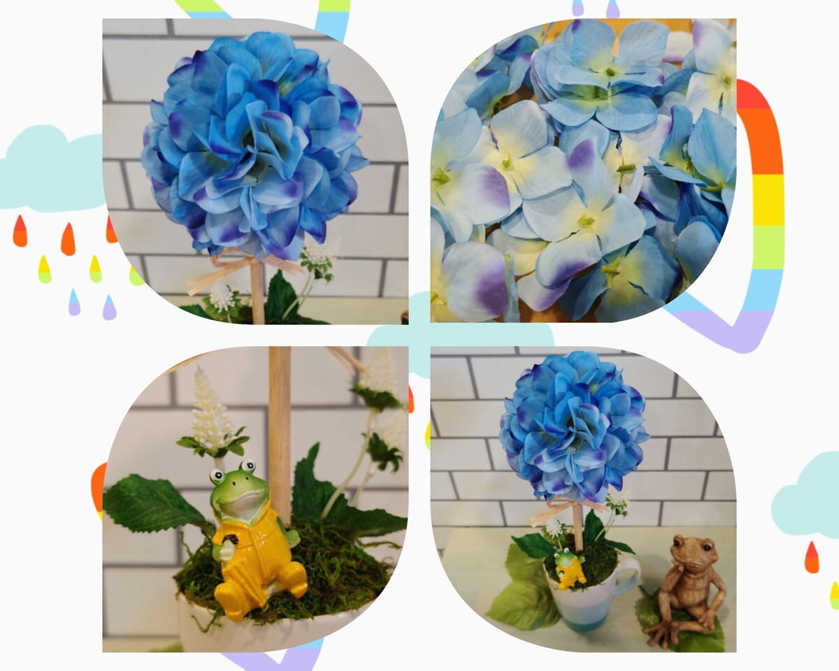 傘を持って長靴を履いた🐸さんが とっても可愛いです💕そして、アジサイの色も とっても綺麗です✨