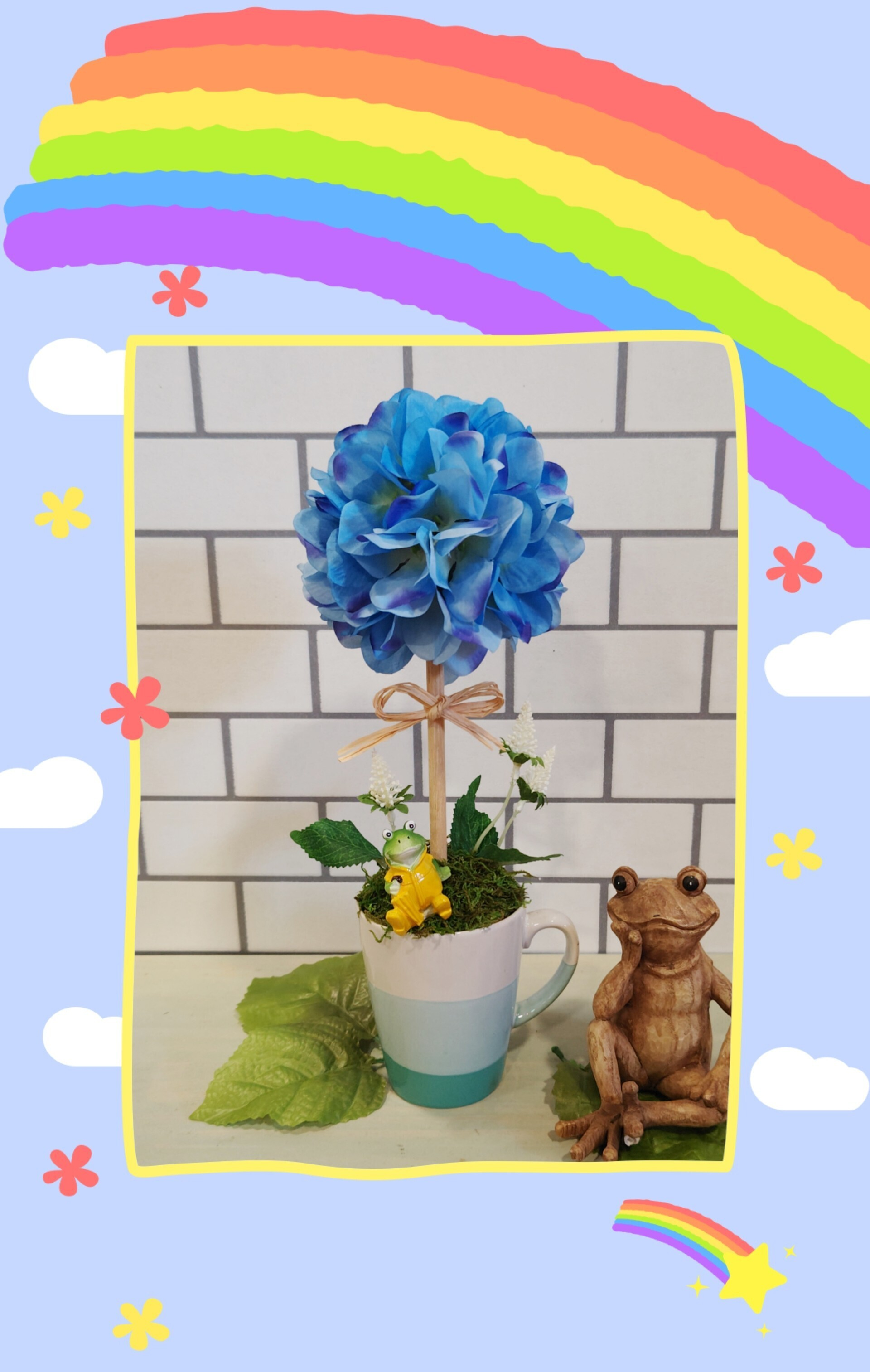 アジサイの葉っぱは、カップの脇に…そして、カインズさんの🐸さんが座っています😆