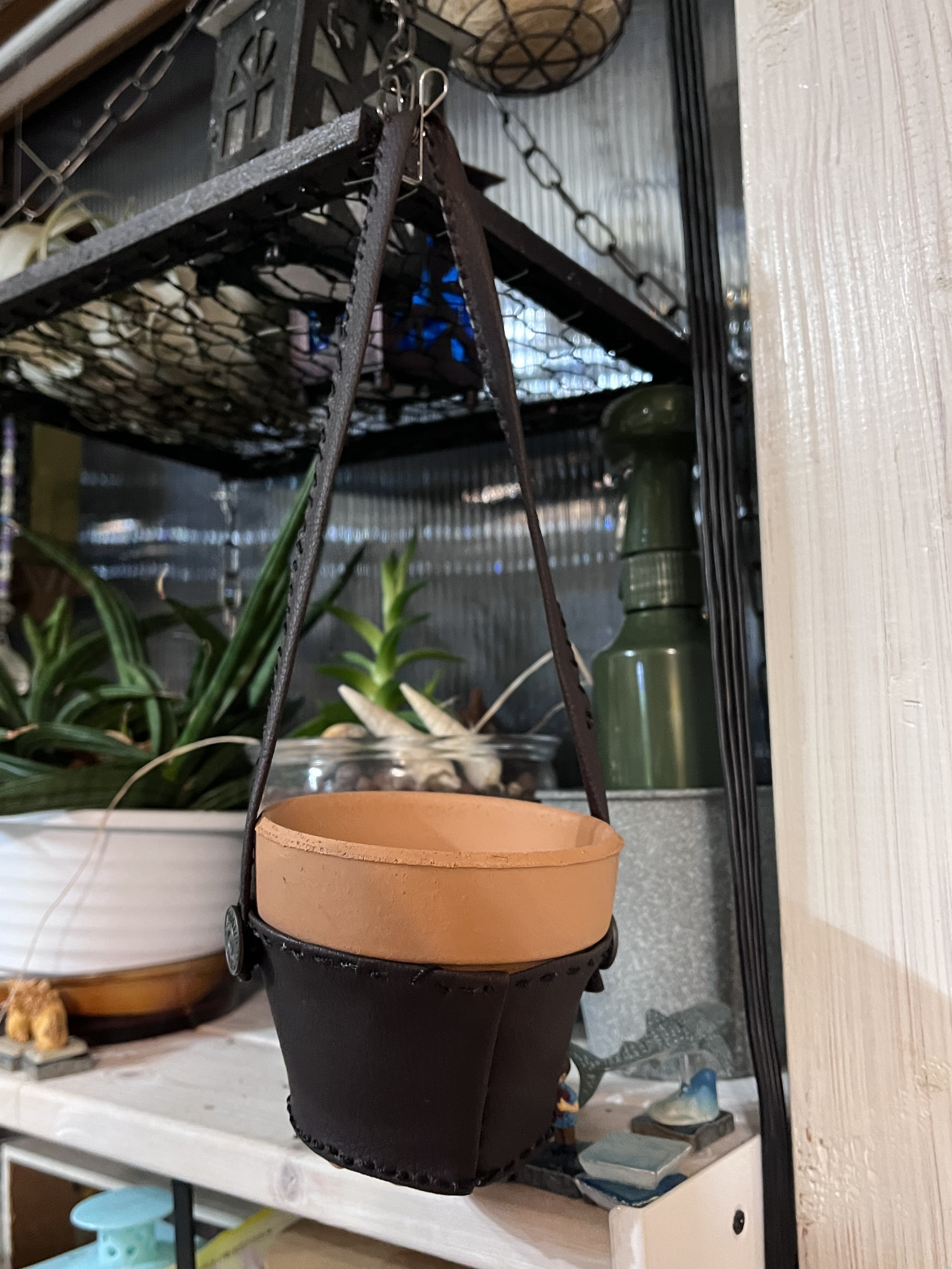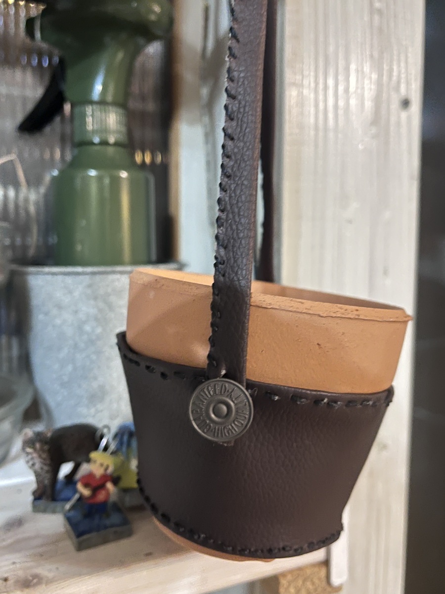 素焼きの植木鉢に革で作ったカバーに、