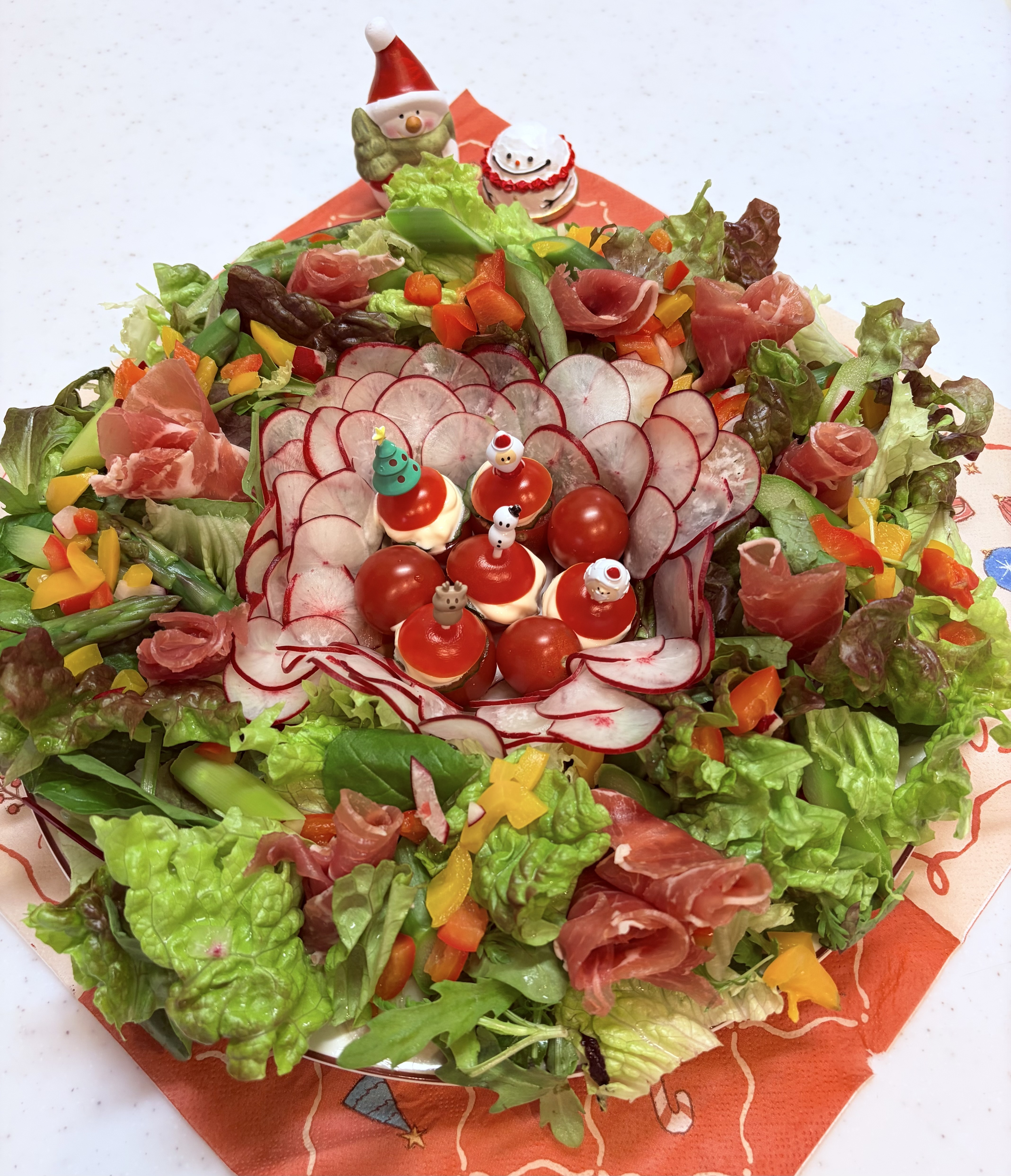 トップ > クリスマスDIY2025 > キャンペーン > クリスマスの彩りサラダ ぽんちゃん 2025/12/20 20:43 クリスマスの彩りサラダ ■作品内容 クリスマスの赤と緑の華やかなサラダに仕上げました! ■工夫ポイント ミニトマトは上の部分を少し切り分け、切り口の上に滑り止め用にきゅうりを乗せてからマヨネーズをその上に乗せて、上の部分をのせました。 また生ハムはバラの形に巻き、パプリカは小さく切り可愛く仕上げました! ベビーリーフ、サニーレタス、アスパラも使い、クリスマスならではの豪華なサラダです! とても美味しかったです! クリスマスパティシエ部門【2025】 いいね 共有する 共有する X LINE リンクをコピー コメントする 2 件の返信 (新着順) ミュートしたユーザーの投稿です。 投稿を表示 ラルチャエ 2025/12/21 13:02 にぎやかな豪華なサラダですね✨✨手も込んいて 食べるのも、楽しそうですね💮 いいね 返信する ミュートしたユーザーの投稿です。 投稿を表示 チコリ 2025/12/21 02:09 凄く手間のかかった贅沢なサラダですね🥗 テーブルが華やぎますね😁 いいね 返信する ミュートしたユーザーの投稿です。 投稿を表示 ぽんちゃん 2025/12/21 07:31 チコリ ありがとうございます! ミニトマトのサンタさんは、初めはうずらの卵を使おうかと思ったのですが、茹でるのが面倒なのと高価なのとで「マヨネーズでいいじゃん!!」となりました😆 いいね 返信する