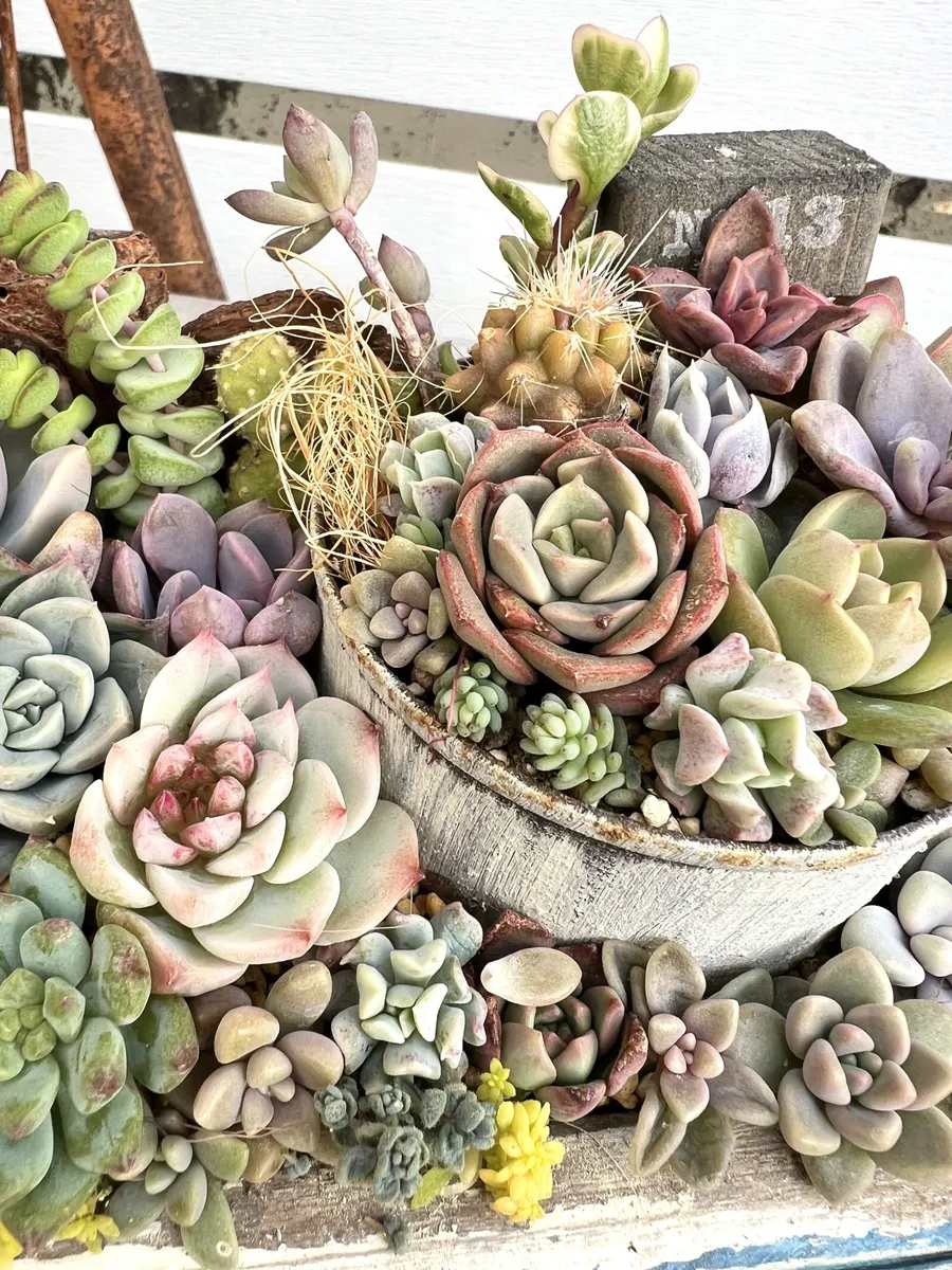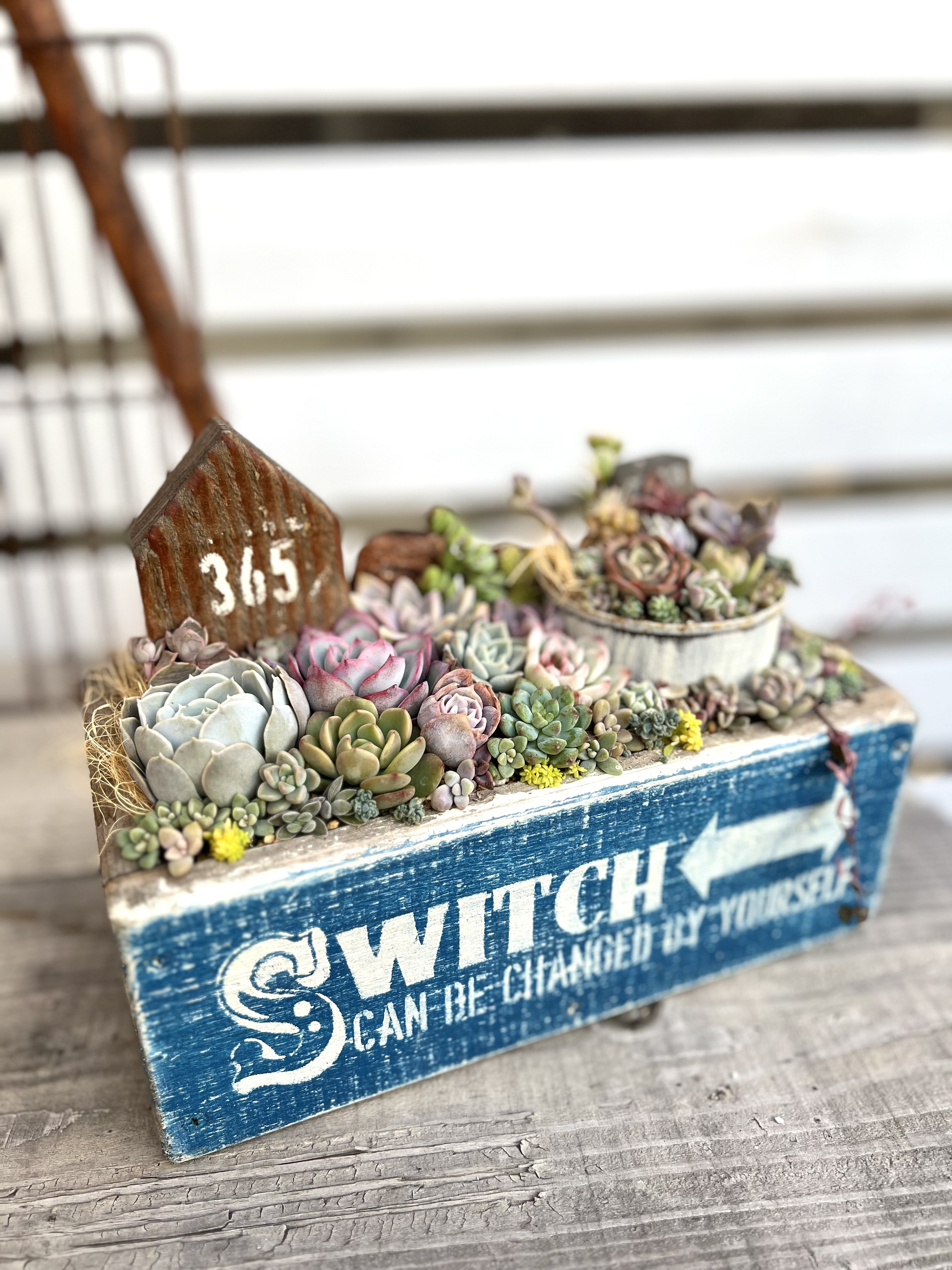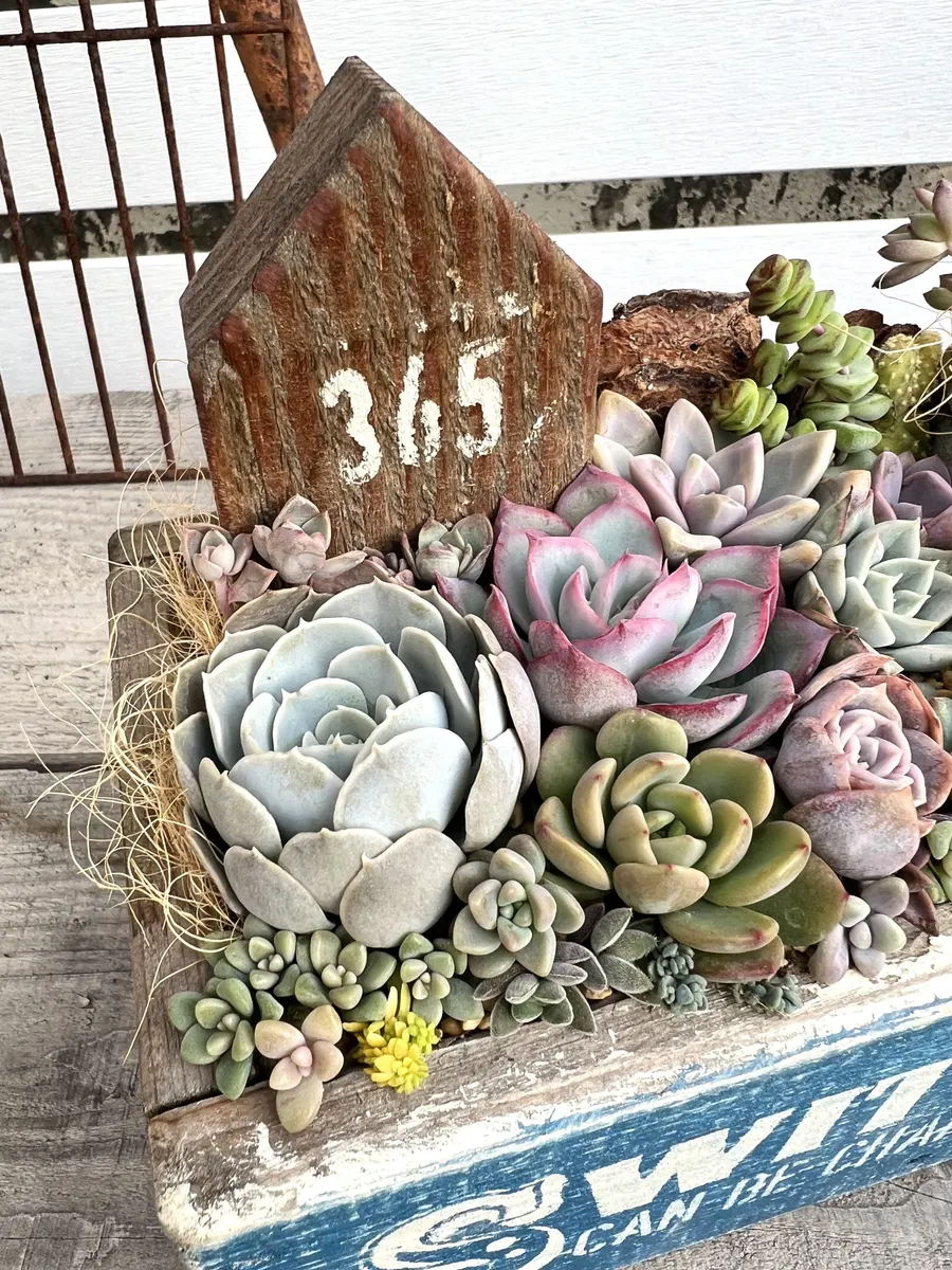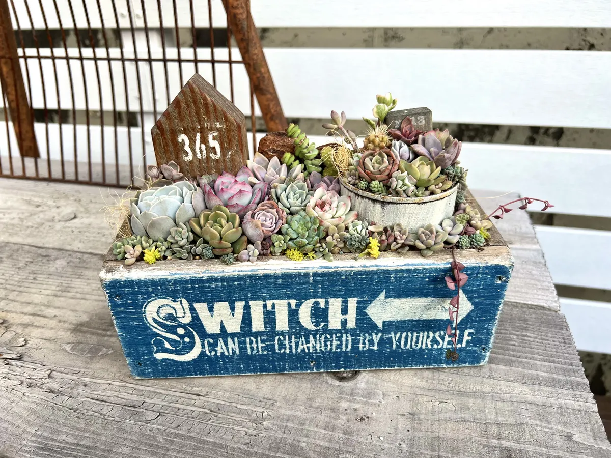 多肉がびっしり、これは豪華ですね 何より自分は木箱に目が入ってしまいます、やれ方がなんとも言えずいいですね ビンテージな雰囲気出てますね😊