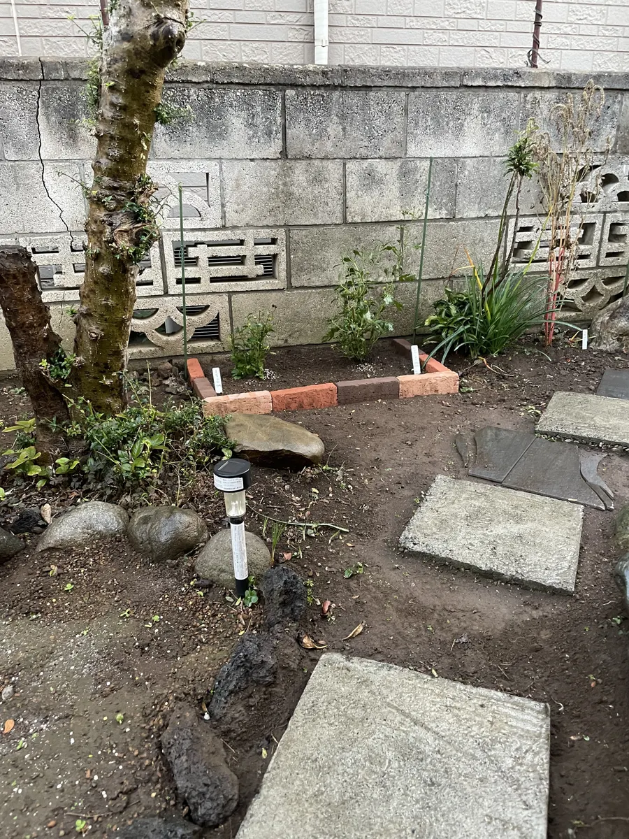 3月に苗植えした場所の陽当たりがあまり良くなかった気がしたので、ついでにレンガ花壇にしました。