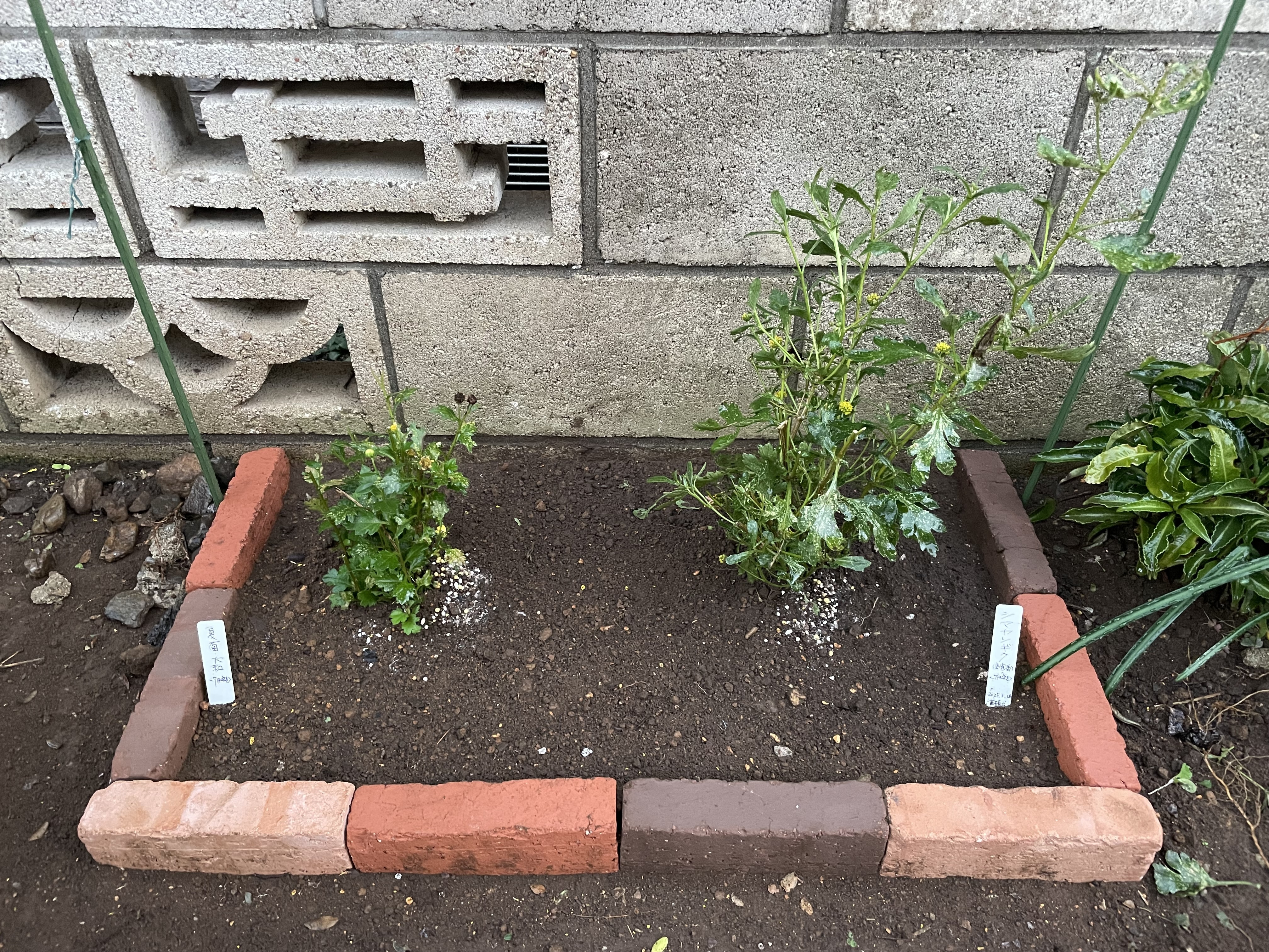 7月咲き小菊2種を移植、ついでにレンガ花壇設定