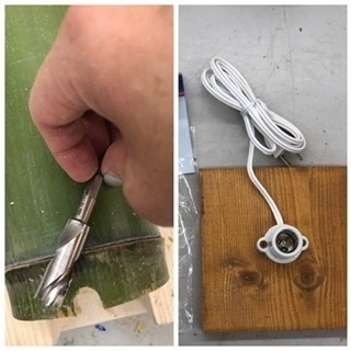 ライトのコードが通る裏側に穴開けして、板に陶器のコード付きレセップをピスで止めます。