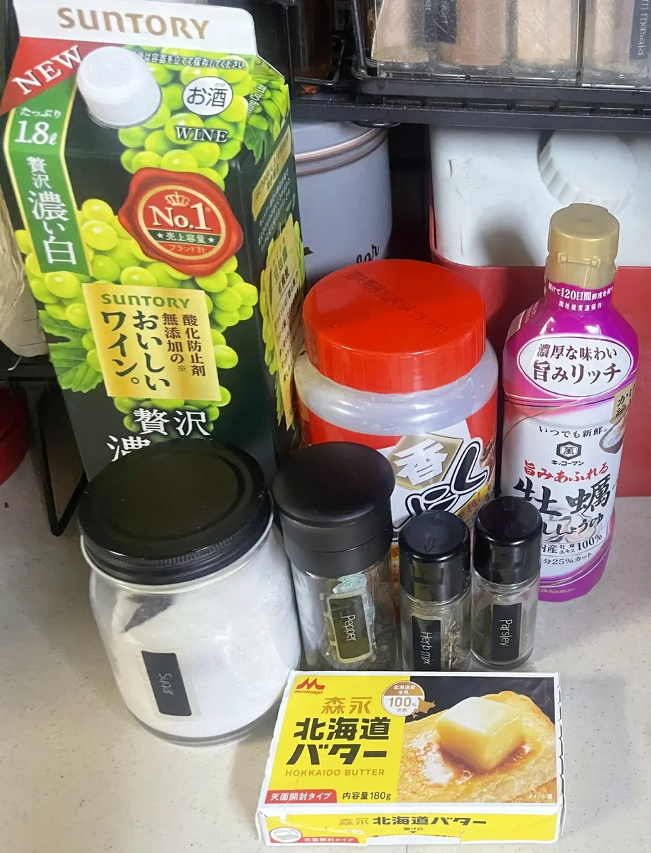 白ワイン・ニンニク・牡蠣醤油・味の素・ミル挽き黒胡椒・バジル・パセリ・バター✨