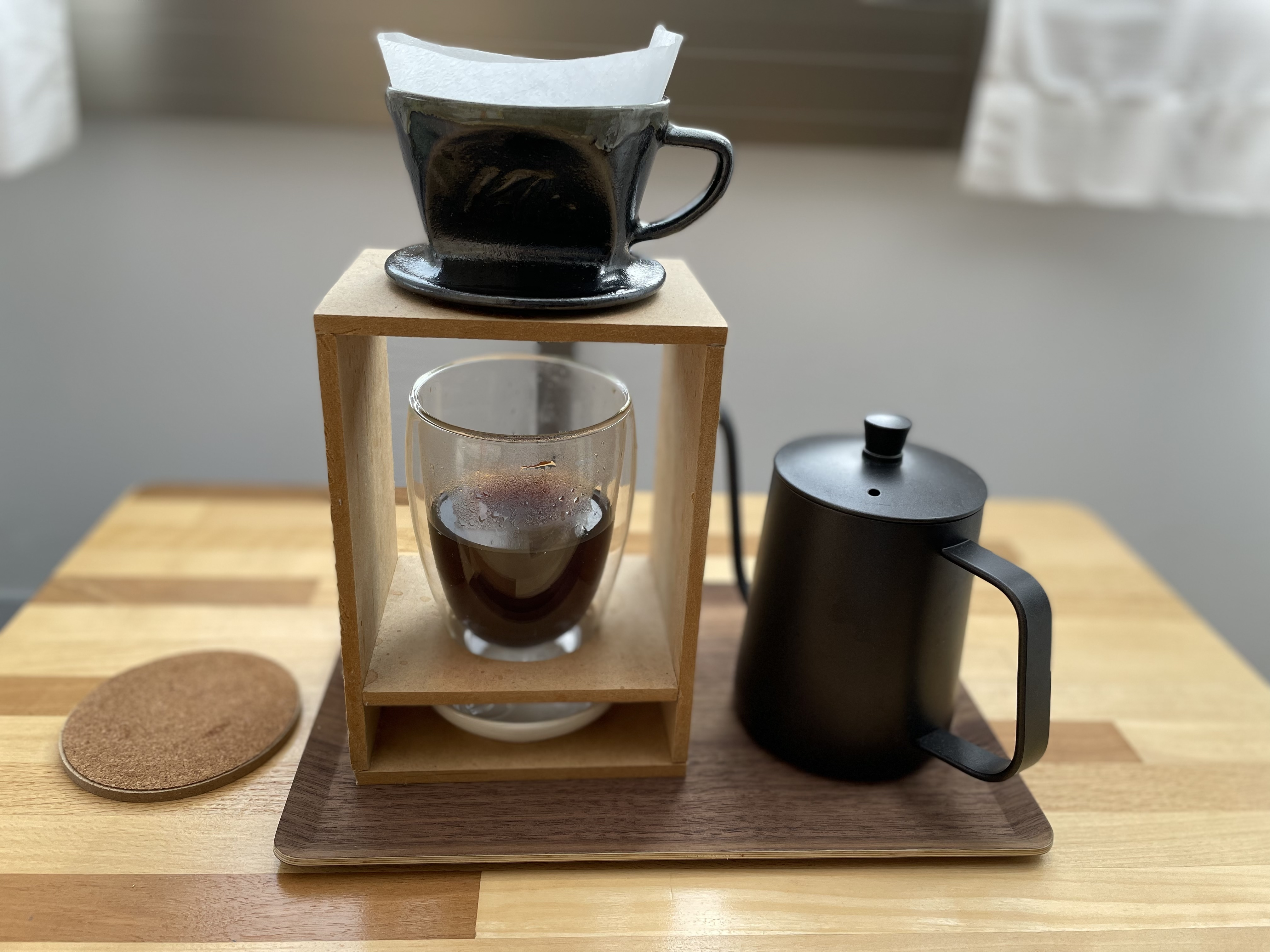 手作りならではのユニークポイントは、中段のカップ置き部にも穴が開いていて、その下の段に小皿がセットできるので、抽出完了後にカップを外しても、ドリッパーからポタポタ出てくるのを受けられるようになっています。