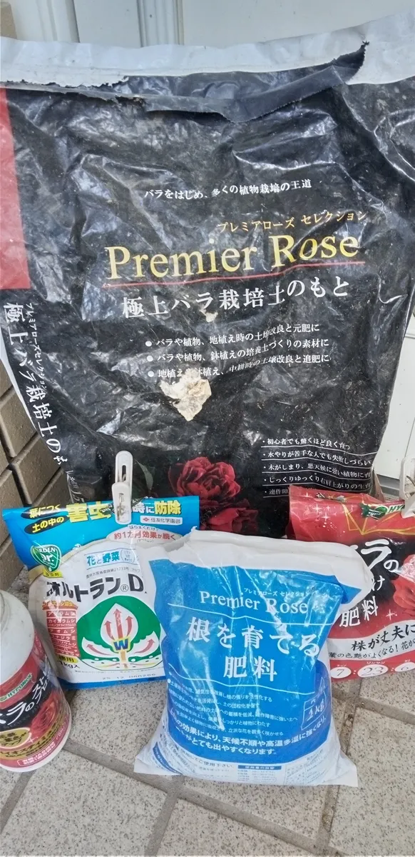 ②新しい鉢に薔薇用培養土、オルトラン、薔薇用肥料、根を育てる肥料を入れて混ぜ合わせます。