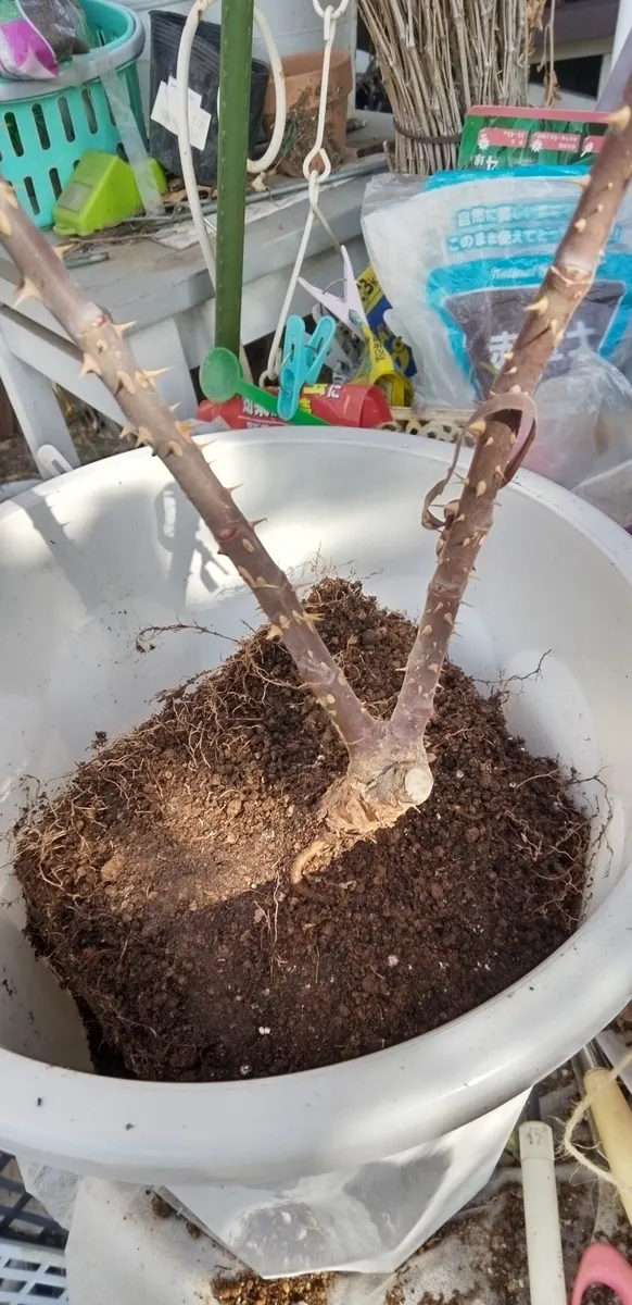 鉢薔薇の中央の枝が無くなった株の鉢増し