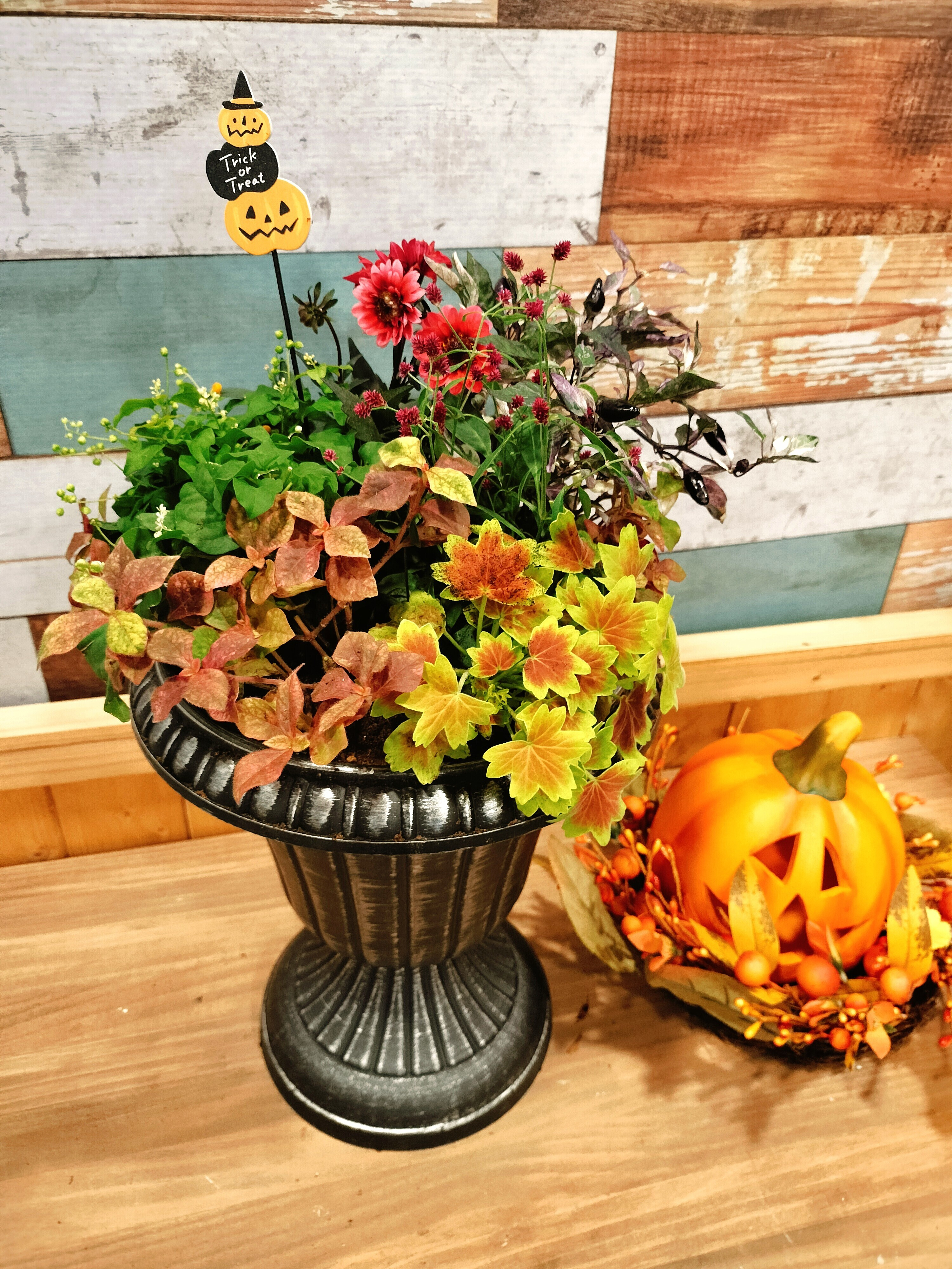 大雨の中、ハロウィンの寄せ植えを作成しました😆