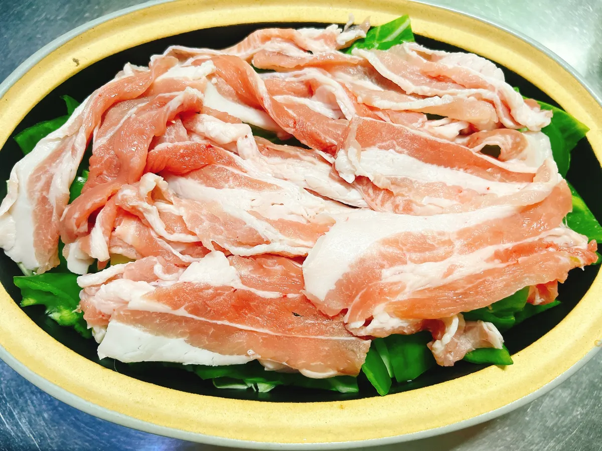 食材をカットして、パスタポットにキャベツ・ピーマン・豚肉の順に入れます。