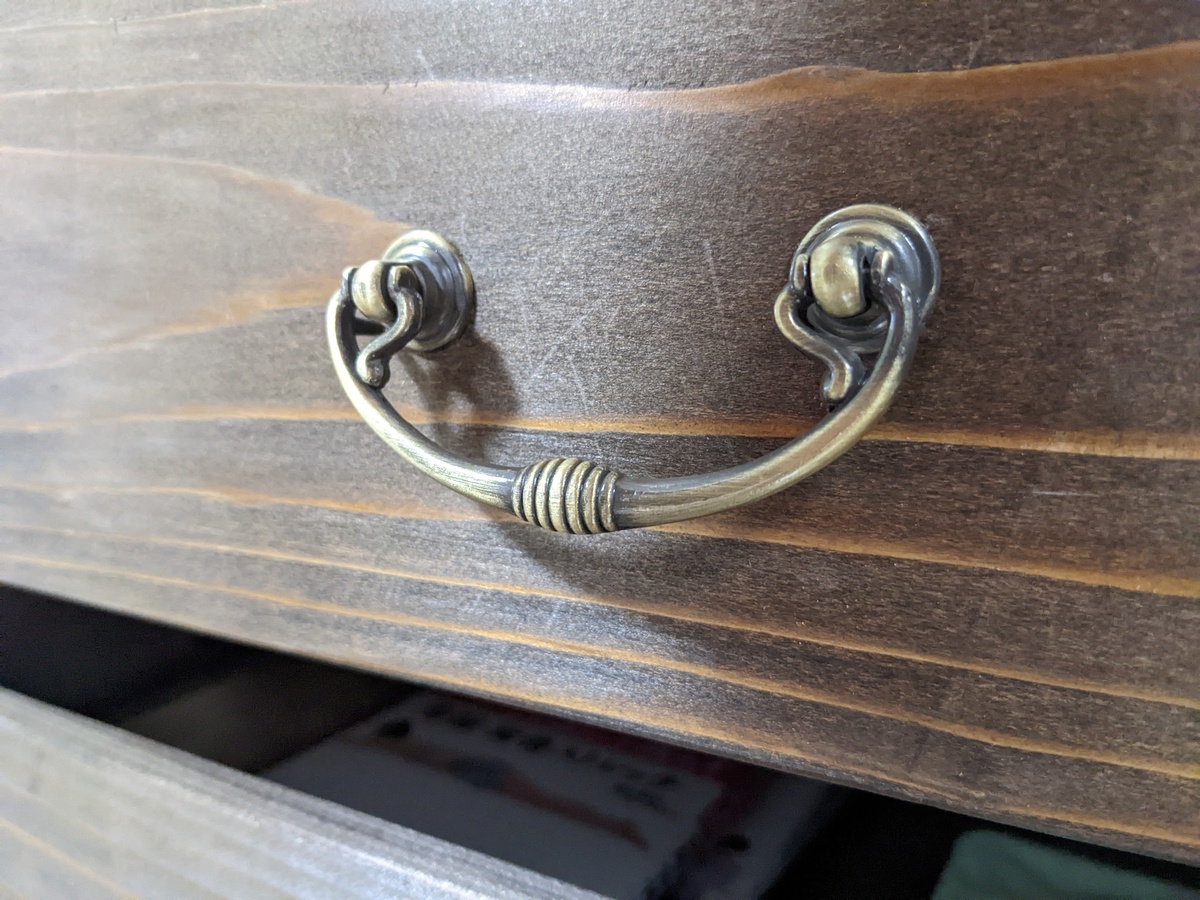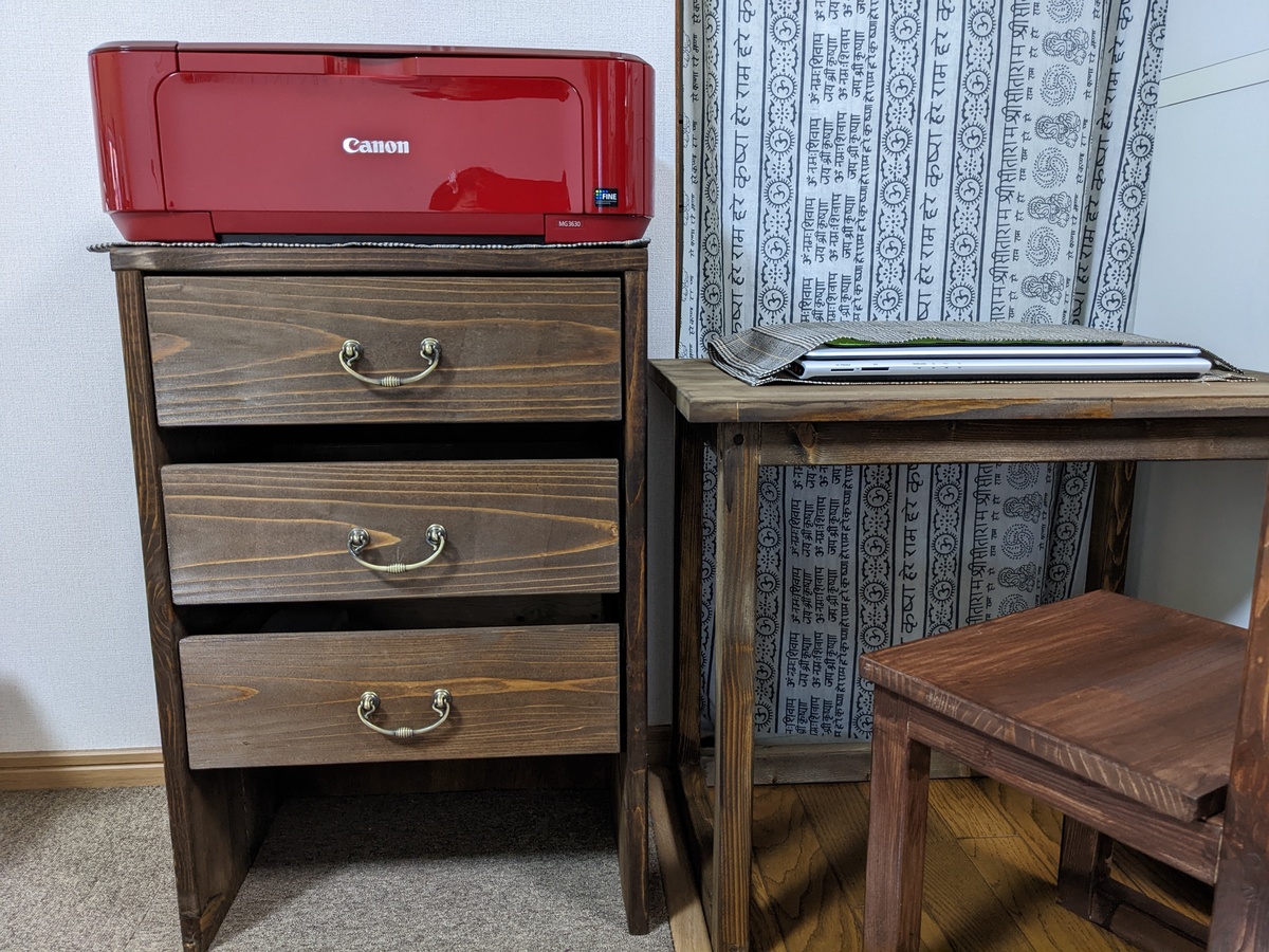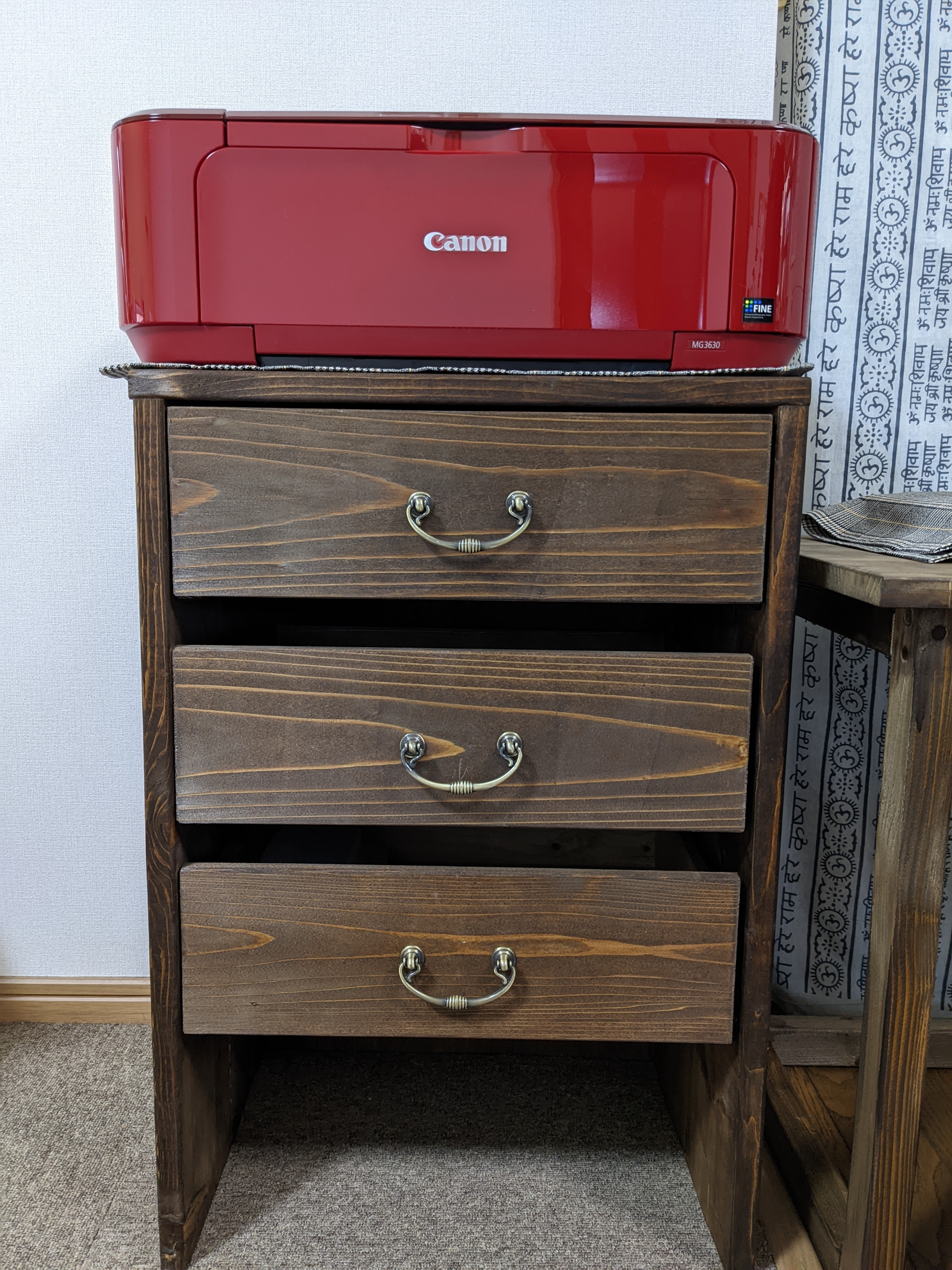 キッチンシェルフに取手つけた事で高級感増し増し、複合機サイズにぴったり!まるで寸法を合わせて作ったみたいです👍