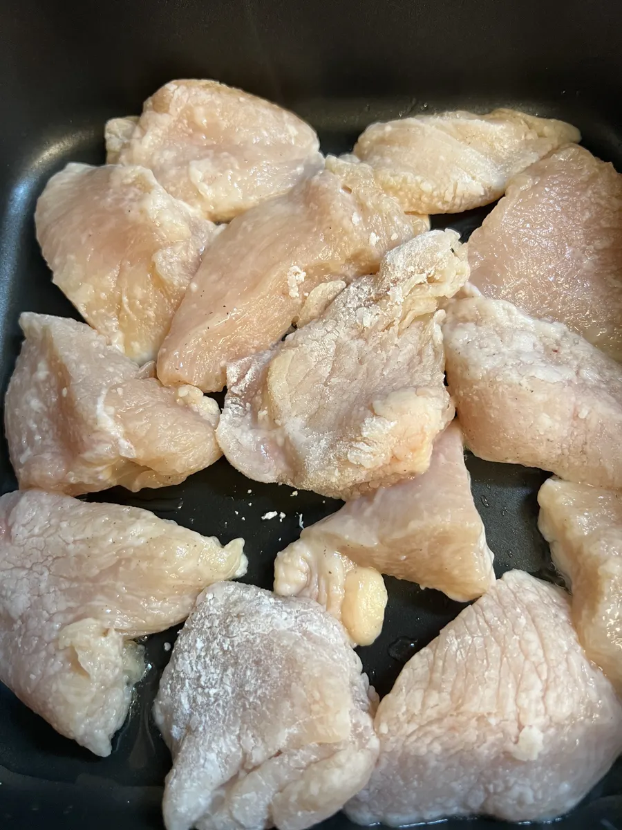 ②胸肉はひと口大にそぎ切りにし、酒、砂糖と一緒にビニール袋に入れてよく揉みこみ、片栗粉も入れて粉をまぶす。