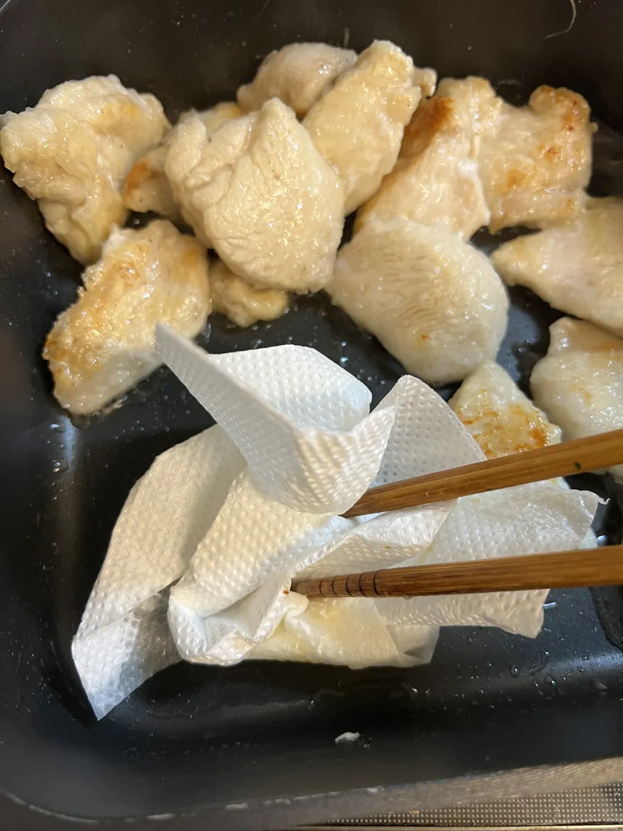 ④中まで火が通ったら、ペーパーで余分な油を拭き取る。