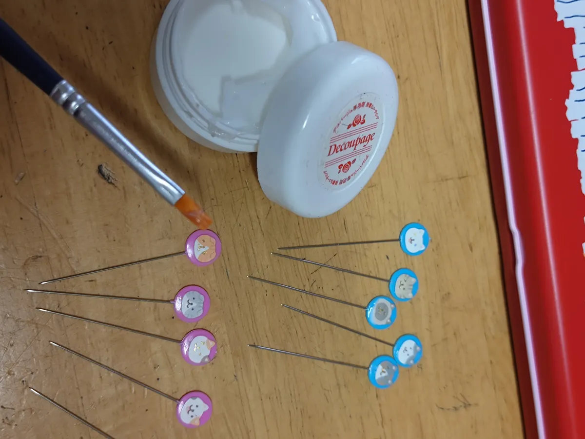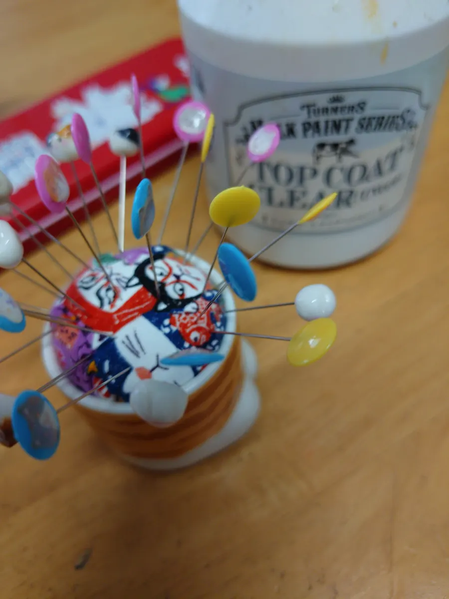 まち針に樹脂粘土を付けて立体ニャンコまち針&シール貼ってニスでコーティングした平面バージョンも♥️