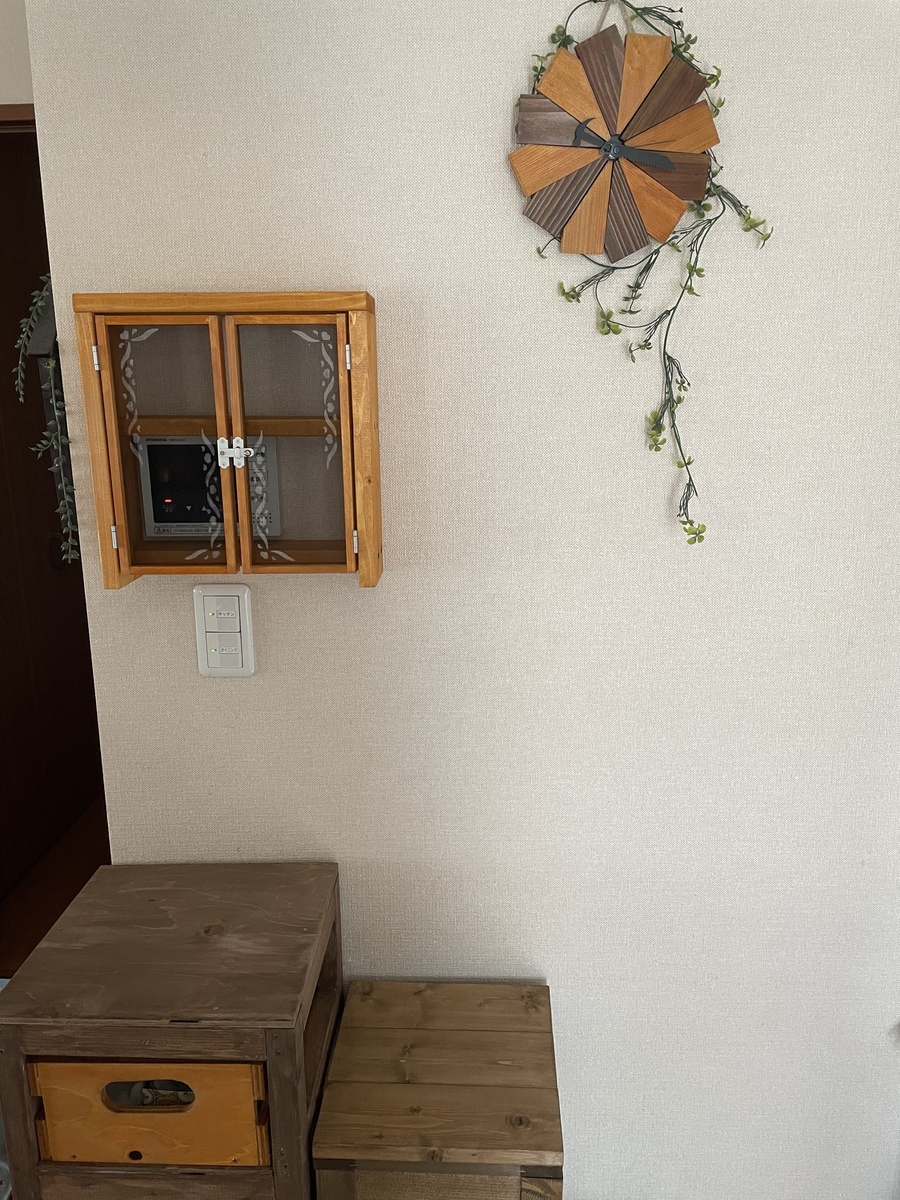 お風呂の給湯器のリモコン?を隠すのにいいかなと思い、サイズを測って行ってそれに合わせて棚の位置を少し変えさせていただきました。
