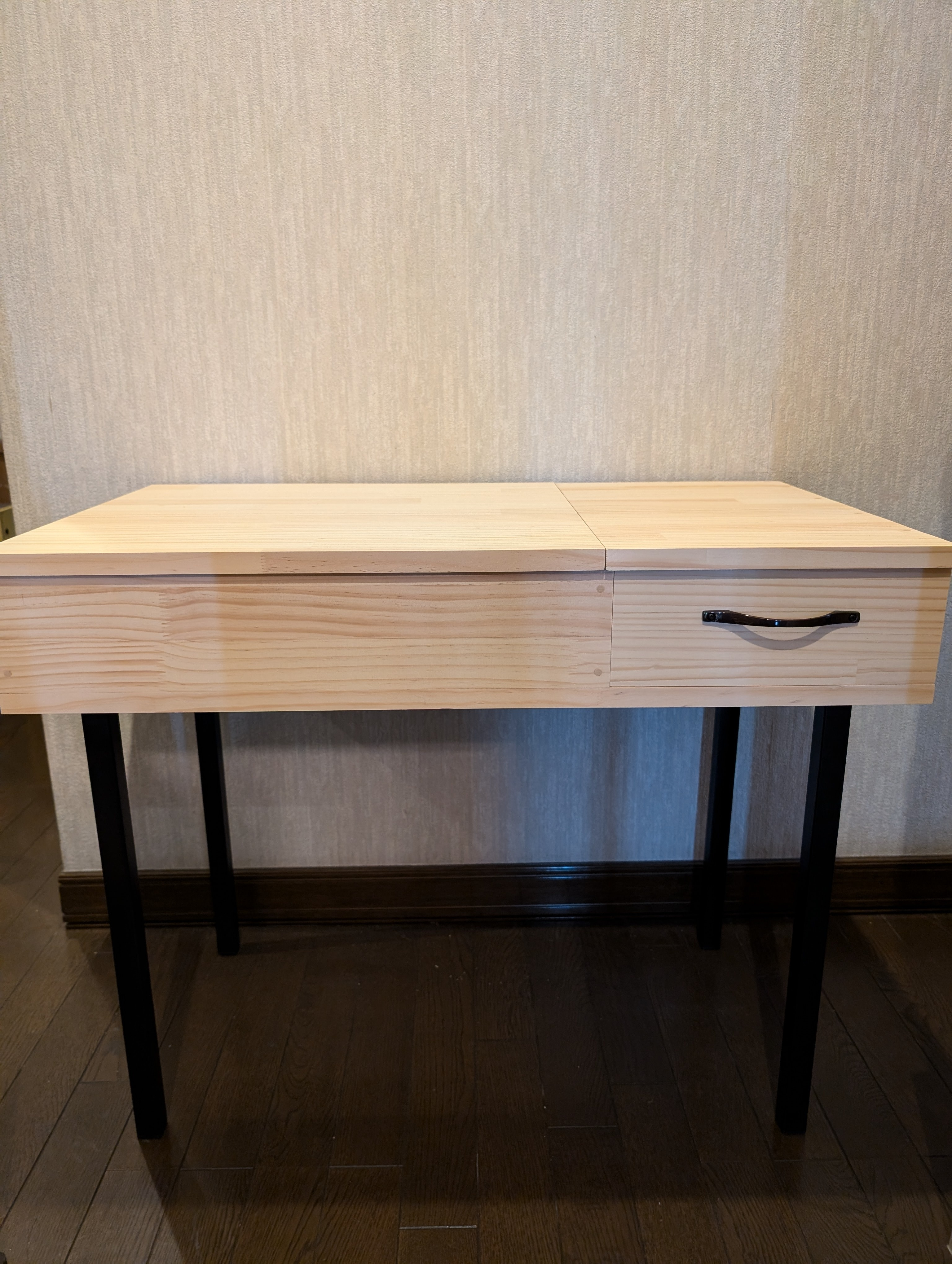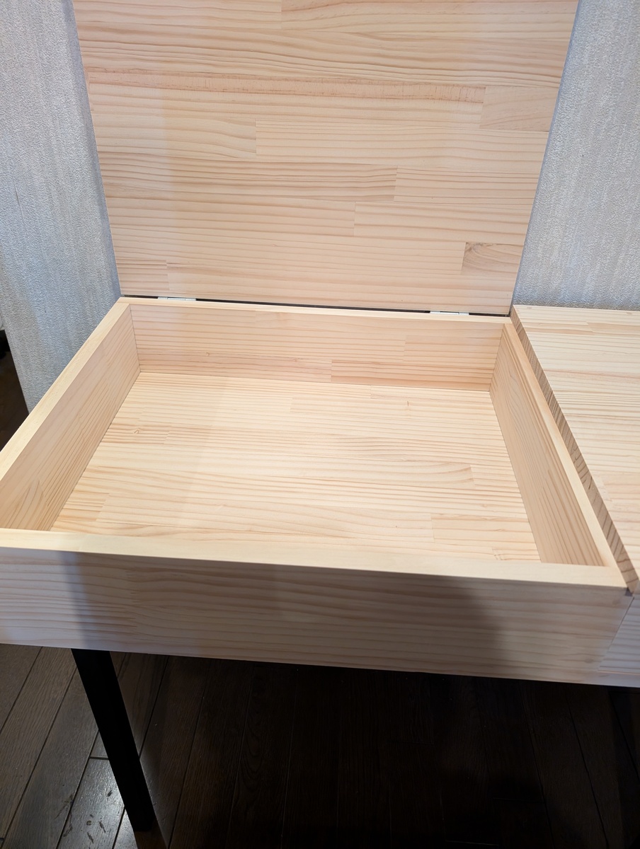 天板を上げると収納スペースがあり、右側は引き出しになってます🎶
